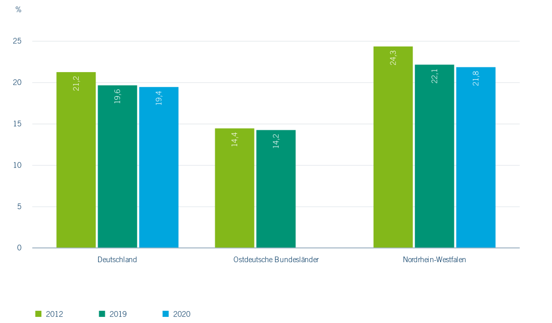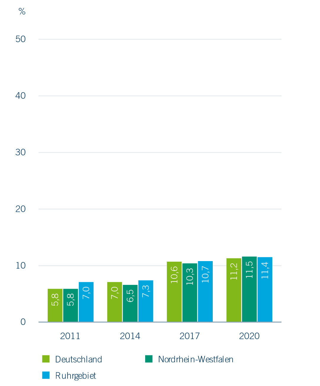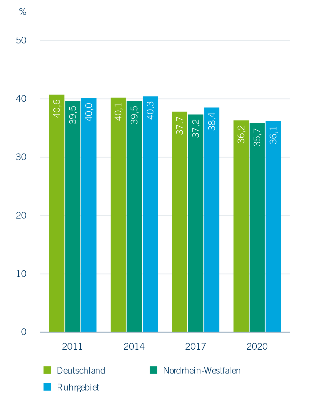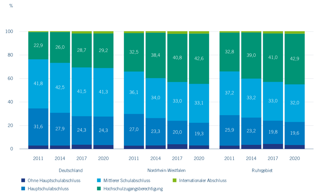 Insgesamt ging die Zahl der Ausbildungsstellen in Deutschland zwischen 2011 und 2020 um 17,7 % zurück (NRW: –18,4 %, Ruhrgebiet: –20,7 %). Der Anteil weiblicher Auszubildender nahm weiter ab und beträgt derzeit nur noch etwas mehr als ein Drittel. Zugleich wuchs der Anteil der Auszubildenden mit ausländischer Staatsangehörigkeit nach 2014 deutlich, was insbesondere auf die Integration der 2015/16 neu zugewanderten Jugendlichen in die Berufsausbildung zurückzuführen ist.