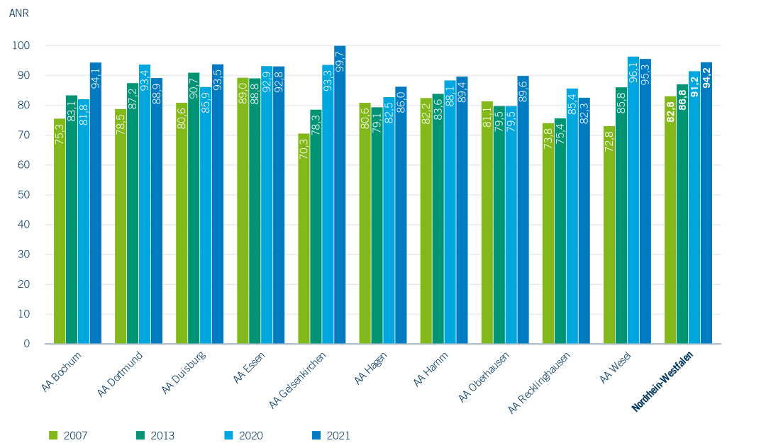 Innerhalb von NRW weisen die Ausprägungen für das Ruhrgebiet sowohl im Zeit- als auch Regionalvergleich eine große Varianz auf (Abb. 2.3-3).