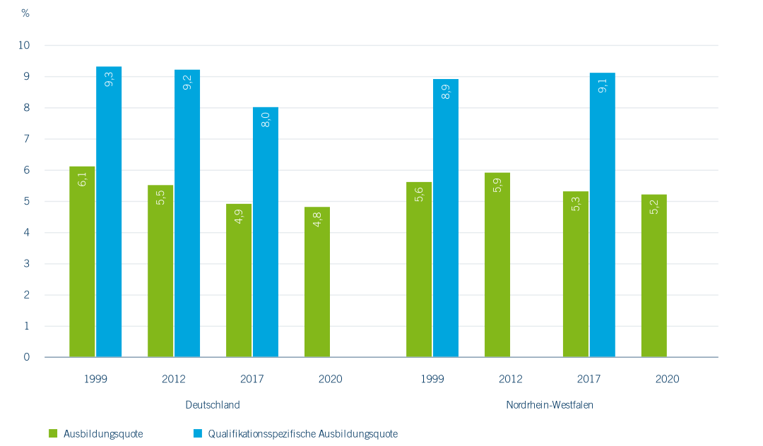 Die Ausbildungsbeteiligung der Betriebe wird primär über die Indikatoren Ausbildungsquote und Ausbildungsbetriebsquote erfasst. Die Ausbildungsquote (AQ) ist definiert als der Anteil der Auszubildenden an den sozialversicherungspflichtig Beschäftigten (Seeber u. a. 2019, 62).
