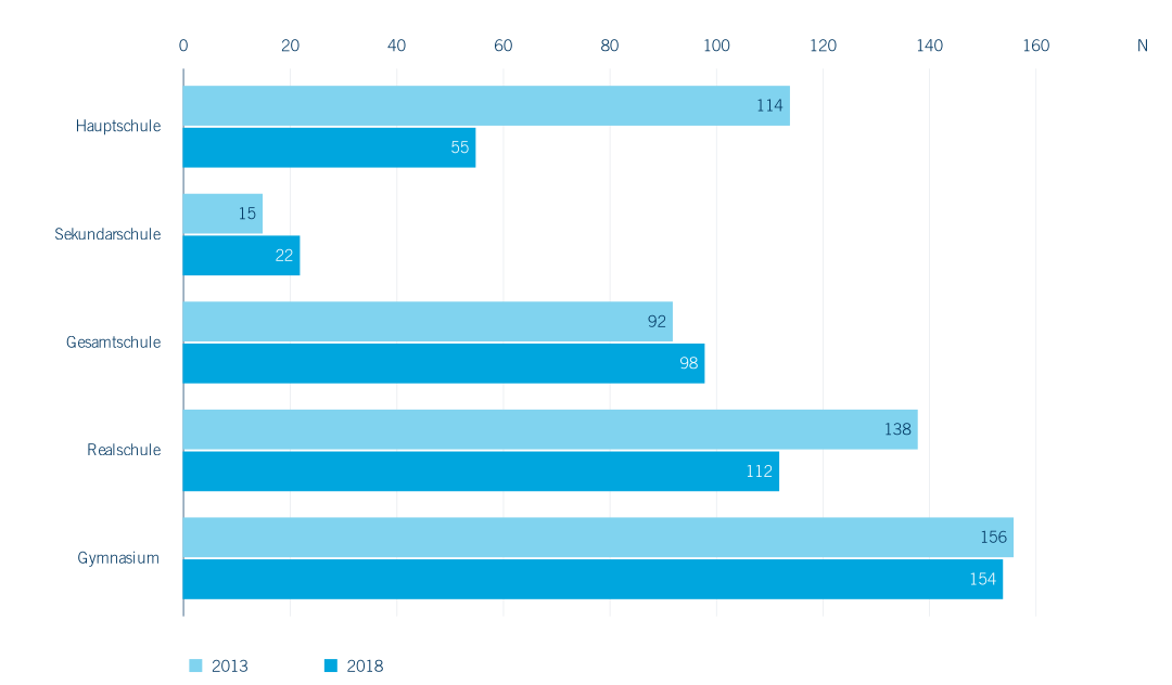 Die Anzahl der weiterführenden Schulen ist zwischen 2013 und 2018 von 537 Schulen auf 463 Schulen zurückgegangen (Abbildung 3.3). Weiter an Gewicht verloren haben dabei vor allem die Hauptschulen (minus 59 Standorte) und die Realschulen (minus 26 Standorte), während Gymnasien so gut wie unangetastet geblieben sind (minus zwei Schulen). Entgegen diesem Schrumpfungsprozess ist die Anzahl der Gesamtschulen im selben Zeitraum von 92 auf 98 gestiegen. Sekundarschulen, erst 2011 infolge des Schulkompromisses als neue Schulform etabliert, wurden im Zeitraum ebenfalls ausgebaut: Ihre Gesamtzahl ist von 15 auf 22 gestiegen. An 87,3 % aller weiterführenden Schulen lernen Schüler*innen mit sonderpädagogischem Förderbedarf. In privater Trägerschaft befinden sich zwei Sekundarschulen (13 %) sowie zwölf Gymnasien (7,4 %), acht Realschulen (4,8 %) und sechs Gesamtschulen (3 %).