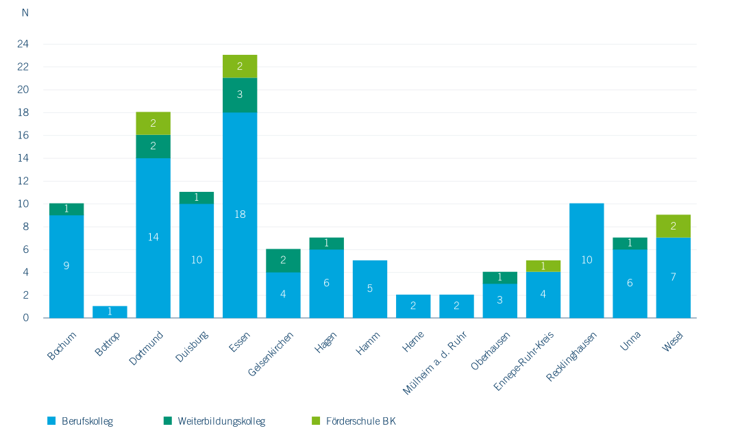 2018 bieten 101 Berufskollegs (2013: 104) in der Metropole Ruhr als Schulformen der Sekundarstufe II 156.000 Schüler*innen unterschiedliche berufliche Qualifizierungen (berufliche Kenntnisse, berufliche Weiterbildung und Berufsabschlüsse) ebenso wie den Erwerb aller allgemeinbildenden Abschlüsse (vom Hauptschulabschluss bis zur Allgemeinen Hochschulreife) (MSB NRW, o. J.-a) (Abbildung 3.5). 28 Berufskollegs befinden sich in privater Trägerschaft, was einem Anteil von 27,2 % entspricht. Zudem offerieren zwölf Weiterbildungskollegs, die Einrichtungen des schulischen Zweiten Bildungsweges darstellen und 2018 von gut 5.400 Schüler*innen besucht werden, zusätzliche Angebote. Sie bieten in den Bildungsgängen „Abendrealschule“, „Abendgymnasium“, „Kolleg“ und „abitur-online“ Erwachsenen Möglichkeiten zum Erwerb höherer Schulabschlüsse (Weiterbildungskollegs NRW, o. J.). 2018 gibt es lediglich ein privates Weiterbildungskolleg. Ergänzend gibt es 2018 sieben Förderschulen (davon sechs private) im Bereich des Berufskollegs, an denen 2.800 Schüler*innen lernen.
