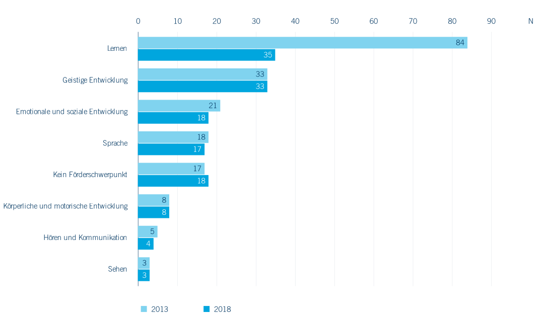 Die Inklusionsbemühungen in NRW zielen darauf ab, dass die sonderpädagogische Förderung normalerweise in der allgemeinen Schule stattfindet (MSB NRW, o. J-b). Gleichwohl können Eltern auch eine Förderschule als Förderort wählen. Zwischen 2013 und 2018 hat sich die Anzahl der Förderschulen im Bereich Grund- und Hauptschule (G/H) von 180 Standorten auf 128 Standorte reduziert. Als alternative Förderorte stehen Waldorfförderschulen sowie Schulen für Kranke zur Verfügung.