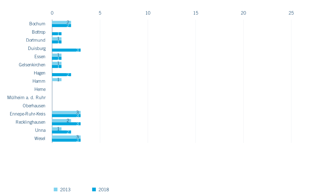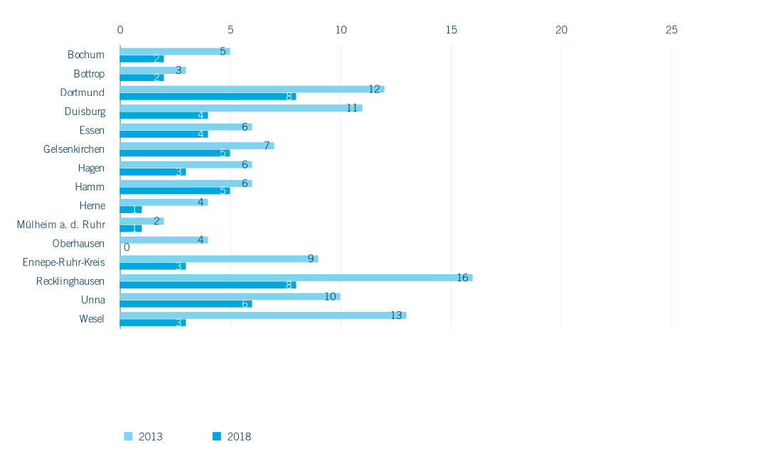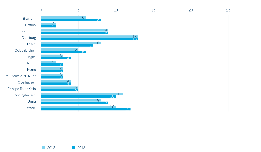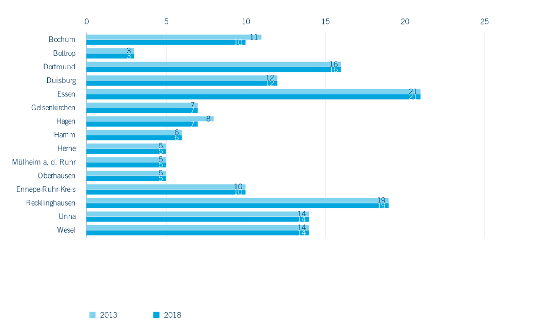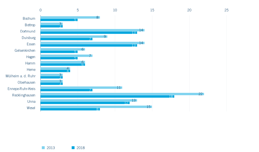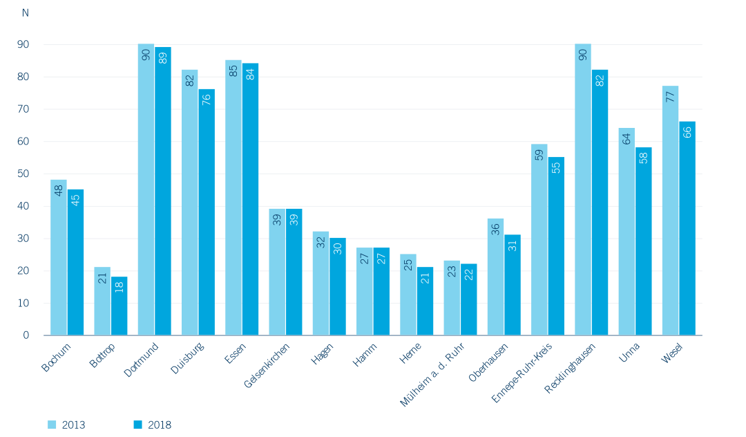 Trotz gestiegener Schülerzahlen im Grundschulbereich finden sich 2018 im Ruhrgebiet mit 743 Grundschulen (darunter zehn private und 733 öffentliche), 55 Standorte weniger als noch 2013. Es handelt sich dabei entweder um Zusammenlegungen oder Schließungen von Standorten. In der Folge kommt es zu einem Anstieg der Zügigkeit wie dem Auffüllen von Klassen (vgl. Kapitel 3.2). In den Kreisen und Städten des Ruhrgebiets fällt die Reduzierung der Grundschulstandorte unterschiedlich aus (Abbildung 3.1). Grundschulen in der Metropole Ruhr bieten ihren Schüler*innen in aller Regel offene Ganztagsangebote an (2018: 95 % der Schulen) und nehmen zumindest vereinzelt Schüler*innen mit sonderpädagogischem Förderbedarf auf oder verfügen über den Status „Schule des gemeinsamen Lernens“ (2018: 86,5 %). Nur zehn der 743 Grundschulen (1,3 %) befinden sich in privater Trägerschaft, das private Angebot wird im Primarbereich durch 20 freie Waldorfschulen ergänzt. Es handelt sich bei den hier betrachteten privaten Ersatzschulen im Bereich der Grundschulen um staatlich genehmigte Schulen in freier Trägerschaft (z. B. evangelische oder katholische Träger), die als verfassungsgemäßer Ersatz für öffentliche Schulen grundsätzlich die gleichen Unterrichtsinhalte bieten und in der Regel staatliche Prüfungen abnehmen – die sogenannten privaten Ergänzungsschulen werden in der amtlichen Statistik nicht erfasst (IT.NRW).