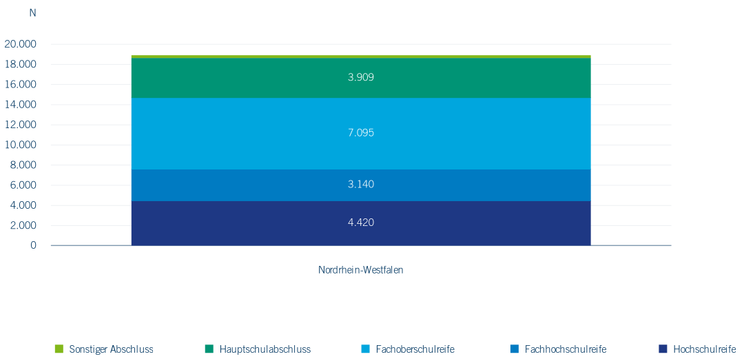 Betrachten wir die allgemeinbildenden Schulabschlüsse derjenigen, die sich für eine Ausbildung an einer Gesundheitsfachschule entschieden haben, so weisen diese ein hohes Qualifikationsniveau auf. 40 % der Schüler*innen sind mit einer Hochschulzugangsberechtigung in die Ausbildung eingetreten, ebenfalls etwa 40 % verfügen über einen mittleren Abschluss und jede/r Fünfte hat einen Hauptschulabschluss.