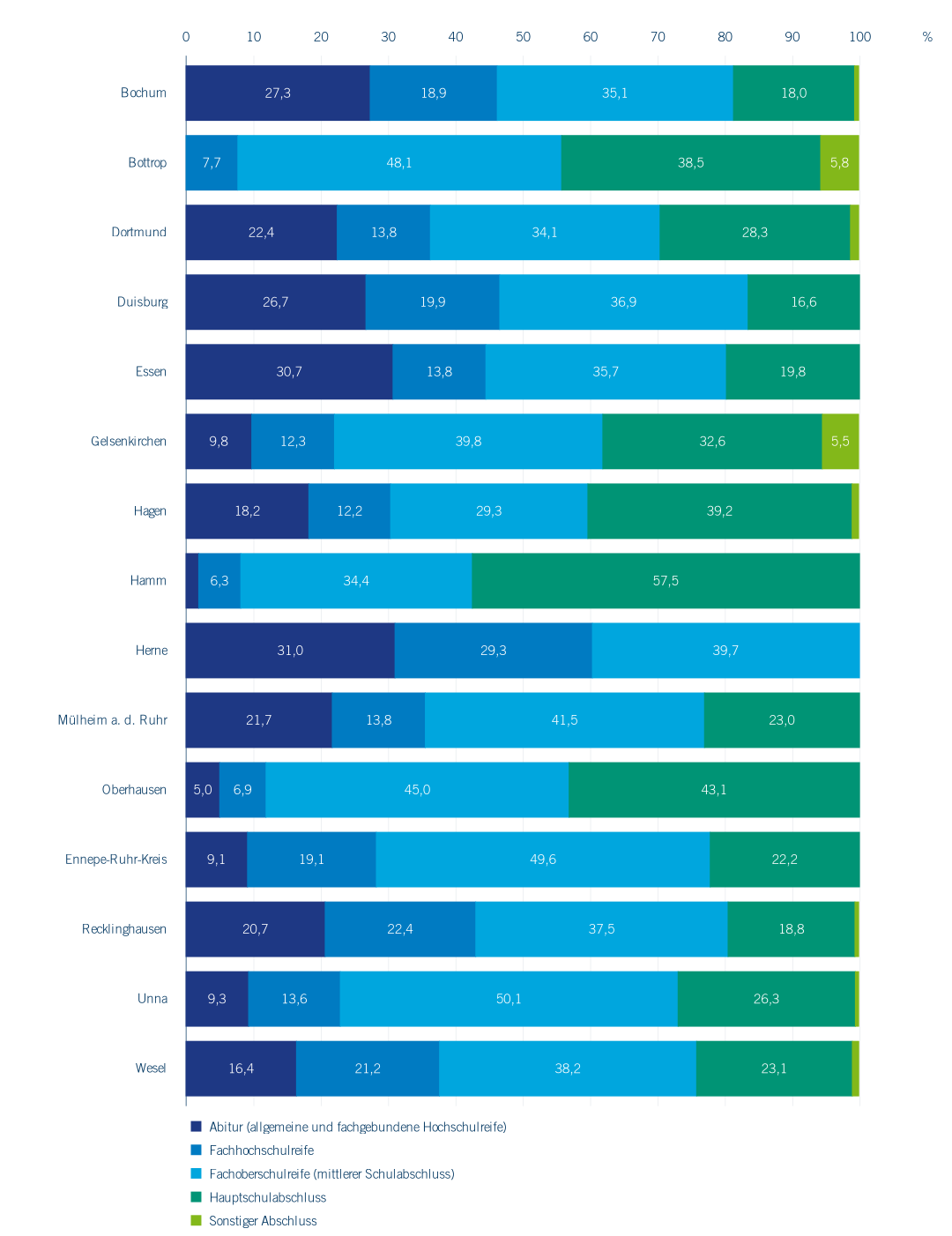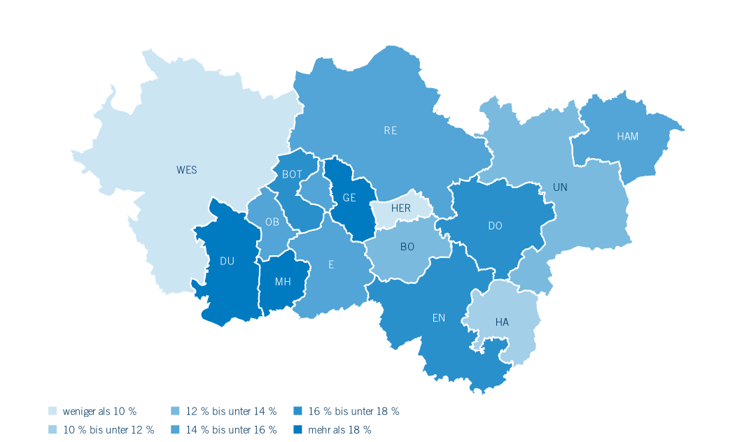 Für das gesamte Ruhrgebiet zeigt sich eine ähnliche Verteilung. Sie differiert allerdings bei getrennter Fokussierung auf die einzelnen Kreise und Städte der Metropole Ruhr, wie Abbildung 4.17 zeigt.