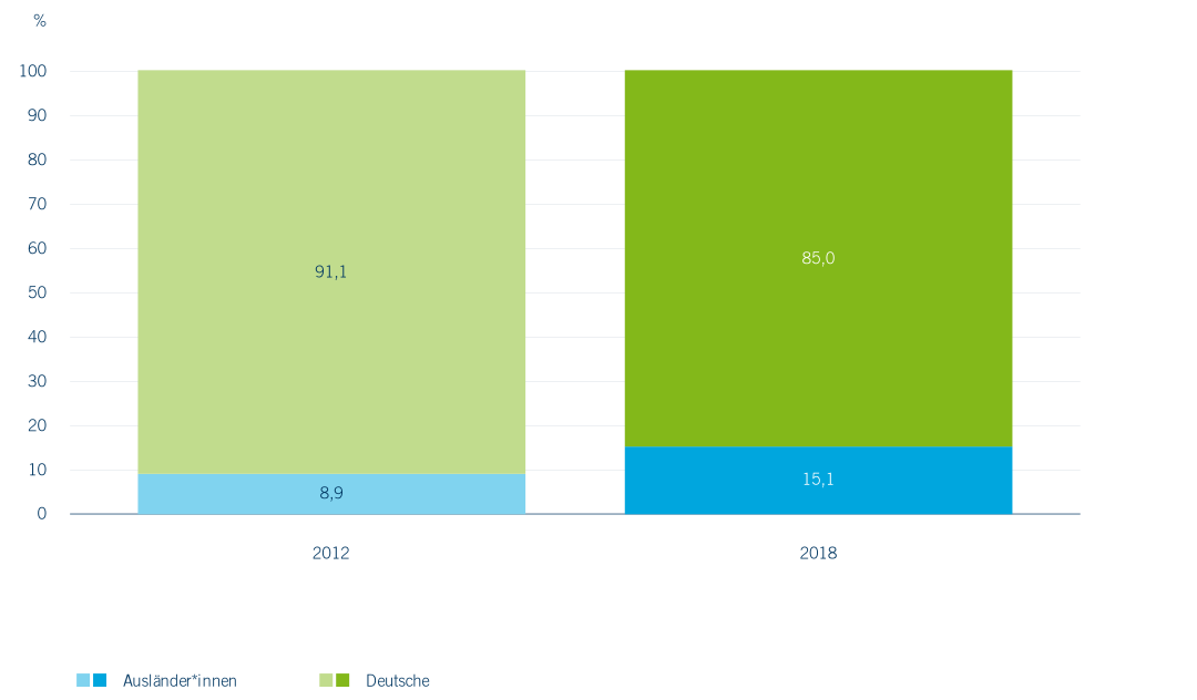 Die Zahlen der Schüler*innen im Gesundheitswesen haben sich zwischen den Schuljahren 2013/14 und 2018/19 lediglich um 2 % im Ruhrgebiet und 1 % in Gesamt-NRW reduziert. Drei Viertel aller Auszubildenden an den Gesundheitsschulen sind Frauen. Der Anteil derjenigen, die eine ausländische Staatsangehörigkeit haben, ist im dargestellten Zeitraum deutlich gewachsen, wie Abbildung 4.14 zeigt.