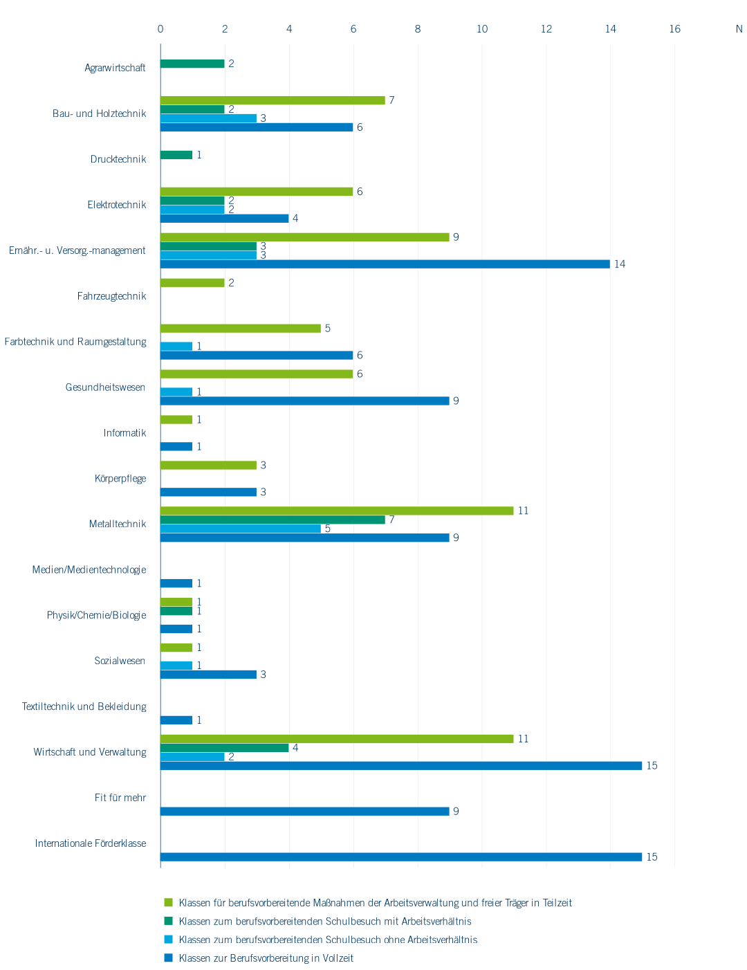 In der gesamten Metropole Ruhr gab es im Jahr 2018 an den Berufskollegs aller Städte und Kreise Klassen zur Ausbildungsvorbereitung in Vollzeit sowie ebenfalls an allen Standorten (außer Bottrop) in Teilzeitklassen für Teilnehmer*innen an berufsvorbereitenden Maßnahmen der Arbeitsverwaltung und freier Träger. Klassen der Ausbildungsvorbereitung mit einem Arbeitsverhältnis bzw. ohne ein Arbeitsverhältnis wurden an den Berufskollegs aller Städte und Kreise (außer Bochum und Bottrop) jeweils in Teilzeit angeboten. Differenziert nach Fachrichtungen zeigt sich folgendes Bild für die Anzahl der Angebote (Abbildung 4.1).