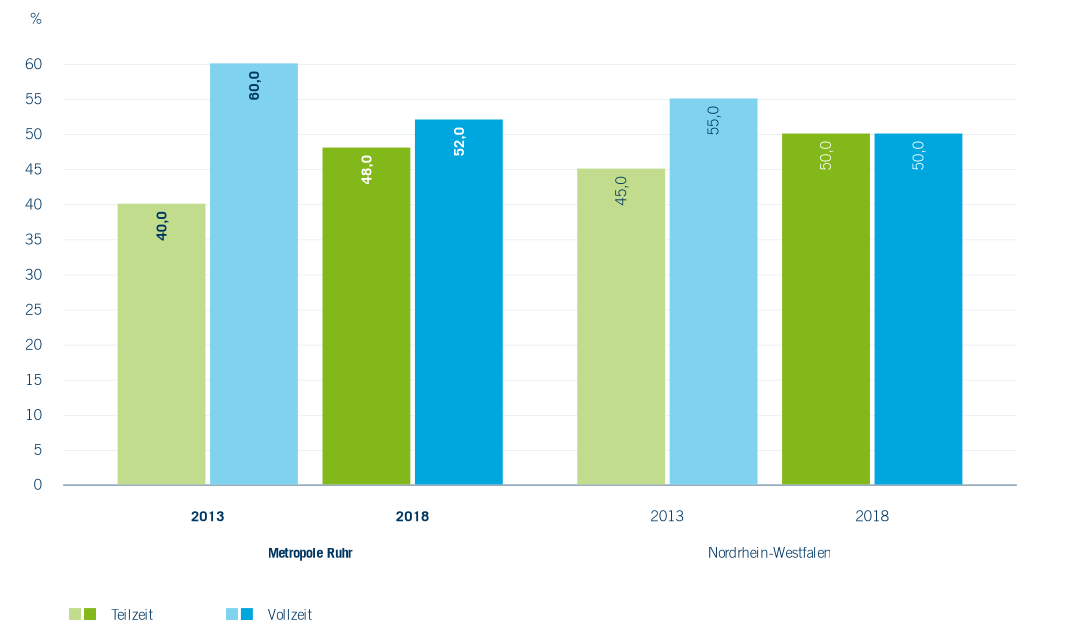 Die Ausbildung in Pflege- und Gesundheitsfachberufen erfolgt in NRW in den Schulen des Gesundheitswesens, für deren staatliche Anerkennung die jeweiligen Bezirksregierungen zuständig sind. Die Ausbildungswege umfassen im Wesentlichen folgende Bereiche: Altenpflege, Ergotherapie, Gesundheits- und Krankenpflege bzw. Gesundheits- und Kinderkrankenpflege, Hebammenkunde, Logopädie, Notfallsanitäter/in, Physiotherapie. In allen Städten und Kreisen der Metropole Ruhr gab es bis zum Schuljahr 2016/17 Schulen des Gesundheitswesens, seither ist der Standort Bottrop entfallen. Die Verteilung im Schuljahr 2018/19 gestaltet sich je nach Standort sehr unterschiedlich, wie der folgende Überblick in Abbildung 4.5 zeigt. Für das gesamte Ruhrgebiet zeigt sich ein Rückgang der Anzahl von Schulen des Gesundheitswesens zwischen den Schuljahren 2013/14 bis 2018/19 um etwa 12 %. Er fällt damit etwas höher aus als der Rückgang in ganz NRW, der bei ca. 10 % liegt. Die Zahl der Lehrkräfte an Schulen des Gesundheitswesens hat demgegenüber im selben Zeitraum zugenommen; das gilt sowohl für Gesamt-NRW mit einem Zuwachs von 10 % als auch für die Metropole Ruhr mit 8 % Steigerung. Etwa drei Viertel des Lehrpersonals sind weiblich; diese Quote blieb über die Jahre relativ konstant. Im Schuljahr 2018/19 waren etwa jeweils die Hälfte der hauptamtlich Beschäftigten in Teilzeit bzw. Vollzeit tätig. Der Anteil der Teilzeitbeschäftigten lag allerdings bei den weiblichen Beschäftigten mit 53 % im Ruhrgebiet und 57 % in Gesamt-NRW etwas höher als bei den männlichen Beschäftigten.
