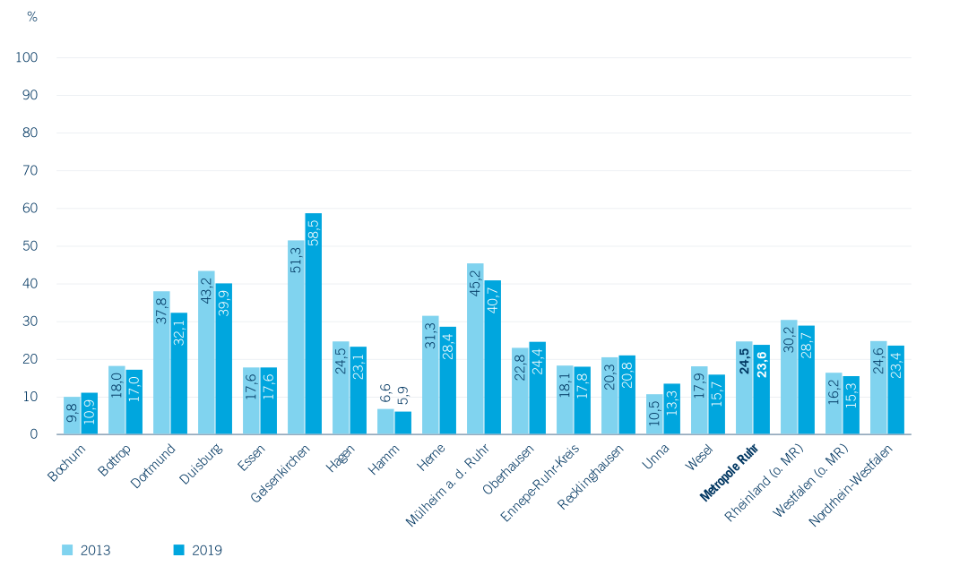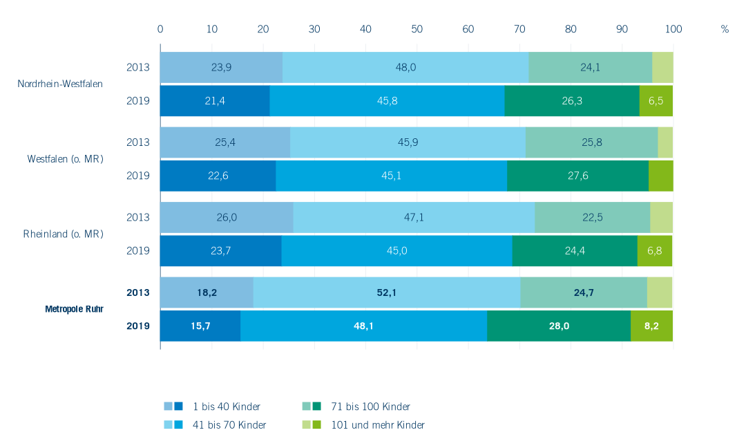 Innerhalb von Nordrhein-Westfalen zeigt sich zum einen, dass der Anteil größerer Einrichtungen in der Metropole Ruhr traditionell höher ist als im Landesdurchschnitt (vgl. Regionalverband Ruhr, 2012a, S. 56), zum anderen ist ein deutlicher Zuwachs des Anteils größerer Einrichtungen zu beobachten. Höhere Anteile an großen Einrichtungen gibt es NRW-weit vor allem in kreisfreien Städten und dies insbesondere im Ruhrgebiet. So liegt der Anteil an sehr großen KiTas – also an Einrichtungen mit mehr als 100 Kindern – in den kreisfreien Städten des Ruhrgebiets bei durchschnittlich 10,4 %. In Gelsenkirchen und Oberhausen beträgt er jeweils 19,5 %. Nach Angaben der Stadt Duisburg beträgt der dort sogar 26,6 % (gegenüber 19,1 % 2013). Hier zeigt sich, dass die Kommunen unterschiedliche Ausbaustrategien verfolgen und teils eher Einrichtungen vergrößern, teils eher neu gründen.