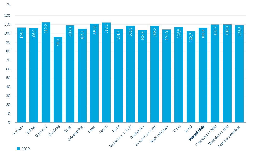 Der Ausbau der Infrastruktur in der frühen Bildung spiegelt sich in der gestiegenen Anzahl an KiTas in fast allen Kommunen der Metropole Ruhr (Abbildung 2.2). Nach Angaben der Kinder- und Jugendhilfestatistik