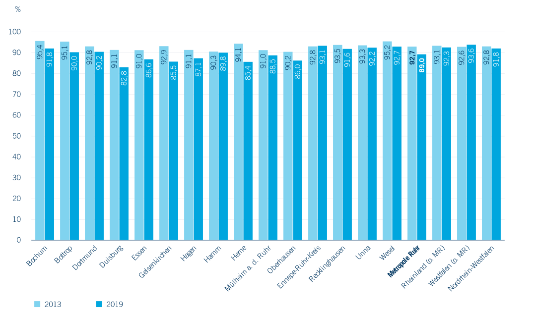 Bei den über Dreijährigen gehen die Beteiligungsquoten zurück. Während die Quote in der Metropole Ruhr noch 2013 mit 92,7 % nahezu exakt dem Landesdurchschnitt von 92,8 % entsprach, ist sie mit einem Minus von fast 4,0 Prozentpunkten deutlich gesunken und liegt 2019 bei 89,0 % – und damit um fast 3,0 Prozentpunkten unter dem Landesdurchschnitt von 91,8 %. Der Rückgang wird im Allgemeinen damit erklärt, dass mit dem Ausbau der U3-Betreuung Plätze für über Dreijährige knapper geworden sind. Eine größere Rolle spielt jedoch die Bevölkerungsentwicklung. Die absolute Zahl der betreuten Drei- bis unter Sechsjährigen ist in der Metropole Ruhr exakt im selben Maße gestiegen wie im Landesdurchschnitt; das Bevölkerungswachstum in dieser Altersgruppe ist jedoch stärker ausgefallen (Abbildung 2.9).