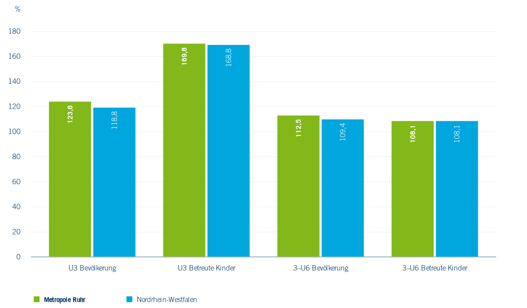 In naher Zukunft ist im Ruhrgebiet von einem steigenden Platzbedarf in Einrichtungen der frühen Bildung auszugehen. Ob und inwieweit der in aktuellen Bevölkerungsprognosen (vgl. Kapitel 1) vorausgesagte Rückgang der Anzahl der unter Dreijährigen in den nächsten Jahren tatsächlich eintreten und etwas später auch zu einem Rückgang des Bedarfs an 3–U6-Plätzen führen wird, ist weder bezogen auf Geburtenentwicklung noch auf Zuwanderung sowie Zu- und Fortzüge sicher vorauszusehen. Insgesamt sind Bedarfsprognosen für die frühe Bildung noch schwieriger zu erstellen als für die Bildungsangebote für andere Altersgruppen, weil Veränderungen der Geburtenzahlen sich sehr kurzfristig in Veränderungen im Platzbedarf niederschlagen. Unabhängig von Prognosen ist sowohl anhand des interregionalen Vergleichs der Beteiligungsquoten als auch angesichts des Rückgangs bei den Drei- bis unter Sechsjährigen in den nächsten Jahren von einem deutlichen Ausbaubedarf der Infrastruktur der frühen Bildung in der Metropole Ruhr auszugehen.