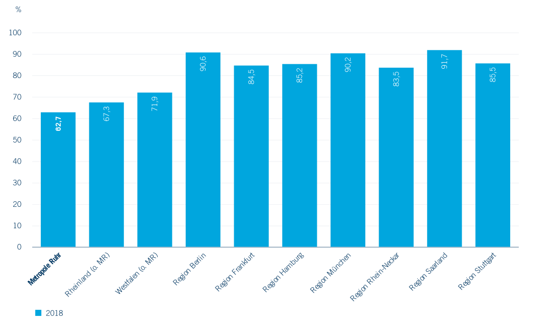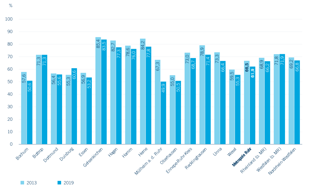 Von hoher Bedeutung ist die Kindertagespflege hingegen für die Betreuung der unter Dreijährigen. Im Jahr 2019 besuchen in der Metropole Ruhr 62,0 % der betreuten Kinder dieser Altersgruppe eine KiTa – gegenüber 66,9 % im Landesdurchschnitt (Abbildung 2.11). Die Unterschiede zwischen den einzelnen Kommunen sind erheblich: In Mülheim a. d. Ruhr hat nur knapp die Hälfte der betreuten unter Dreijährigen einen Platz in einer KiTa, in Gelsenkirchen sind es 83,5 %. Seit 2013 sind die Anteile der Betreuung in KiTas fast überall leicht, mancherorts sogar stark gesunken. Die Kindertagespflege ist also stärker ausgebaut worden als die Betreuung in Einrichtungen, und Kommunen mit einer relativ hohen U3-Quote haben dieses Ziel teils durch eine starke Förderung der Kindertagespflege erreicht. In den untersuchten Metropolregionen außerhalb von Nordrhein-Westfalen sehen die Strukturen durchweg anders aus – dort liegen die Anteile der KiTa-Betreuung zum Teil bei über 90 % (Abbildung 2.12). Inwieweit der relativ hohe und weiter gestiegene Anteil der Kindertagespflege in der Metropole Ruhr den Wünschen der Eltern entspricht oder mit einem Mangel an KiTa-Plätzen zusammenhängt, kann anhand der Zahlen nicht entschieden werden.