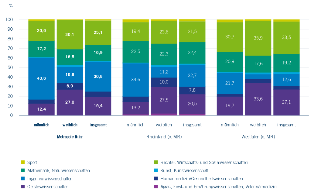 Das Muster der Geschlechtsverteilung innerhalb der einzelnen Fächergruppen in der Metropole Ruhr gleicht weitestgehend dem Muster der Vergleichsregionen. Ausnahmen bilden Mathematik und Naturwissenschaften: Diese Fächer studieren in der Metropole Ruhr mit 52,3 % etwas mehr Männer als Frauen.