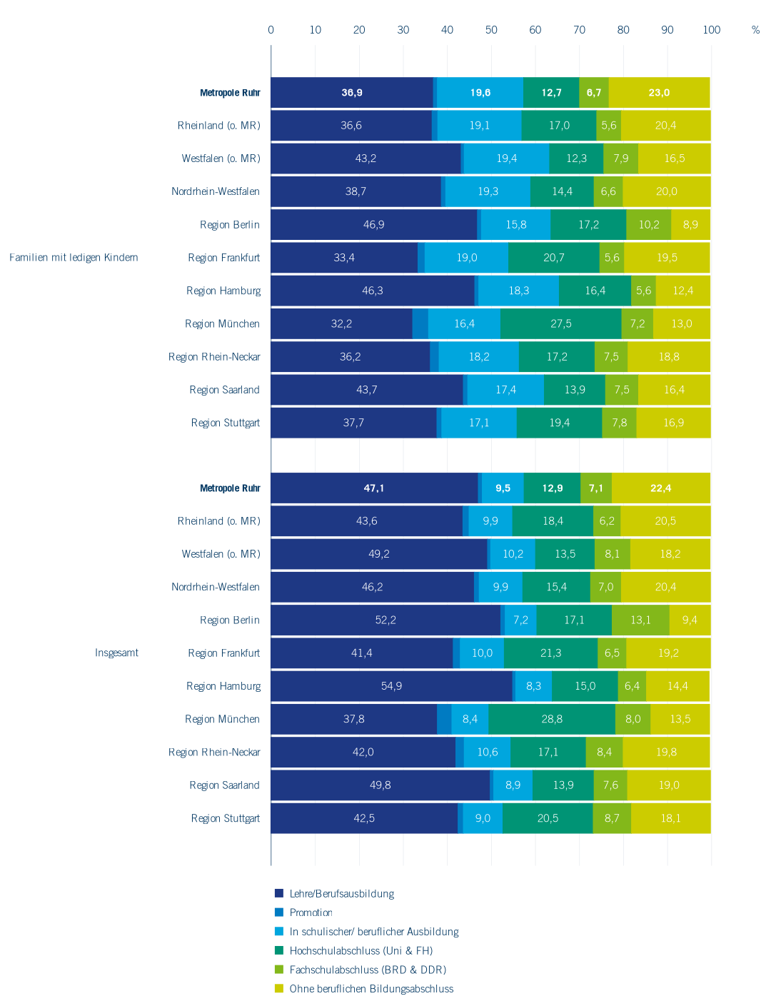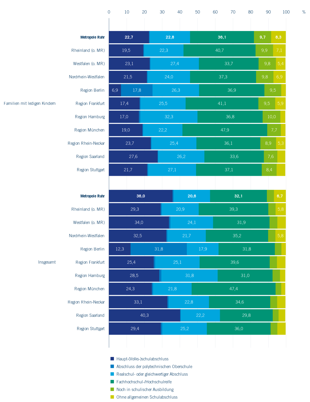 Generell ist zu beobachten, dass diese Anteile, die sich hier auf die Gesamtbevölkerung beziehen, jeweils stark vom Alter der in den Blick genommenen Bevölkerung abhängen. So sind im Ruhrgebiet die Anteile der Volks- und Hauptschulabschlüsse bei über 65-Jährigen mit 65,6 % am höchsten, bei den 20 bis 25-Jährigen liegt der Anteil nur bei 13,2 %. Schränkt man die Betrachtung auf Personen in Familien mit ledigen Kindern ein, sind daher auch die Anteile der Volks- und Hauptschulabschlüsse niedriger und die Anteile der noch in schulischer Ausbildung befindlichen Personen höher.