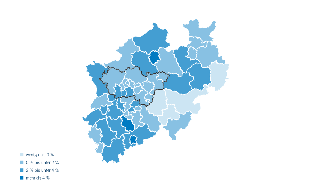 Im Bildungsbericht Ruhr 2012 wurde im Zeitraum 2001 bis 2010 noch ein Rückgang (-3,6 %) der Bevölkerung in der Metropole Ruhr festgestellt. Mittlerweile steigt dort die Einwohner*innenzahl. Abbildung 1.2 zeigt die prozentuale Bevölkerungsentwicklung in Nordrhein-Westfalen auf Kreisebene von 2013 bis 2018. In den meisten Kreisen ist in diesem Zeitraum ein Bevölkerungszuwachs zu verzeichnen. In Nordrhein-Westfalen weisen insbesondere im Rheinland die Städte Köln und Bonn sowie in Westfalen die Stadt Münster größere Zuwächse auf. Rückgänge sind vor allem in Südwestfalen sowie im Kreis Höxter zu beobachten. Das Ruhrgebiet verzeichnet in den größeren Städten (z. B. Essen: +2,3 %, Dortmund: +1,9 %) ein leichtes Bevölkerungswachstum. Kaum Veränderungen finden sich dagegen in den ländlichen Kreisen wie Recklinghausen und dem Ennepe-Ruhr-Kreis. Insgesamt ist die Bevölkerung im Ruhrgebiet von ca. 5,05 Millionen im Jahr 2013 auf etwa 5,11 Millionen Einwohner*innen angestiegen. Das entspricht einem leichten Zuwachs von 1,3 %. Das Rheinland wächst etwas dynamischer um 2,9 % und Westfalen um 1,6 %.