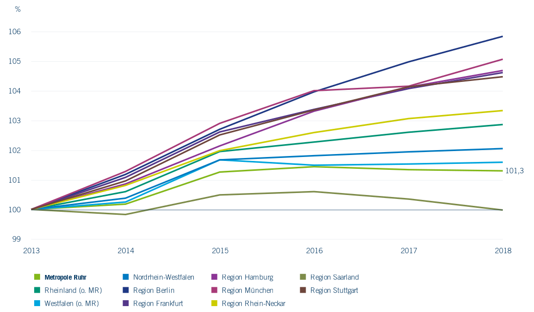 Die meisten Vergleichsregionen weisen im Beobachtungszeitraum bis 2018 deutlichere Bevölkerungszuwächse auf als das Ruhrgebiet. Mit Ruhrgebiet und Saarland weisen in Bezug auf das Bevölkerungswachstum die beiden vom Strukturwandel am stärksten geprägten Regionen die geringste Dynamik auf.