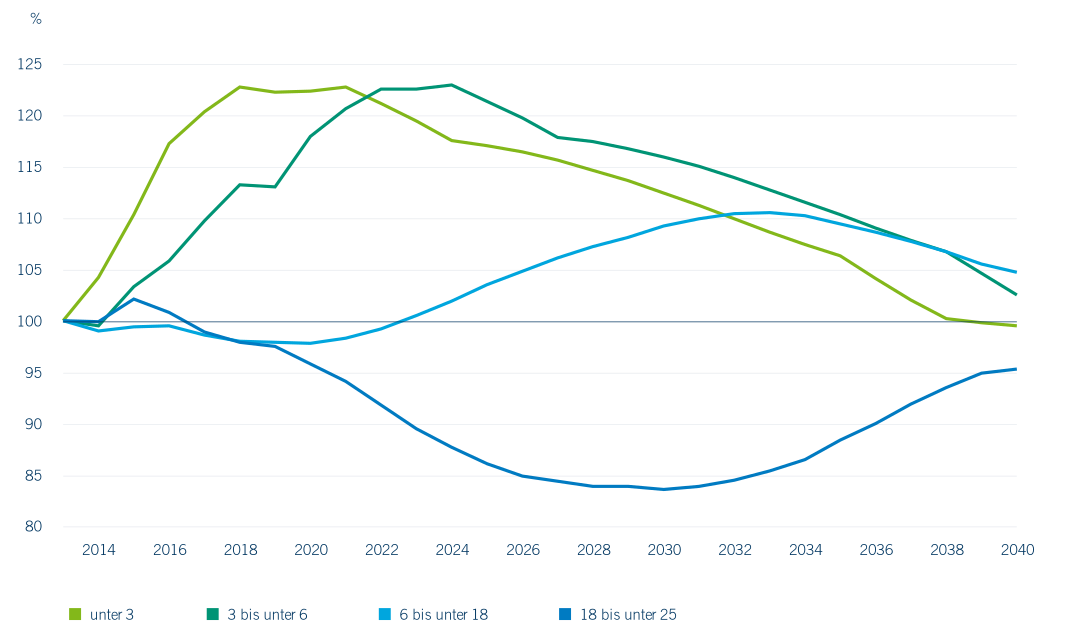 Für die Planung von Bildungsangeboten ist weniger die allgemeine Bevölkerungsentwicklung entscheidend als vielmehr die Entwicklung derjenigen Altersgruppen, für die die unterschiedlichen Institutionen des Bildungswesens verantwortlich sind. Abbildung 1.7 zeigt die Entwicklung bildungsrelevanter Altersgruppen bis unter 25 Jahre im Zeitverlauf in Prozent gegenüber dem Basisjahr 2013. Es wird zusätzlich zur bisherigen Bevölkerungsentwicklung die regionale Bevölkerungsvorausberechnung bis 2040 dargestellt.