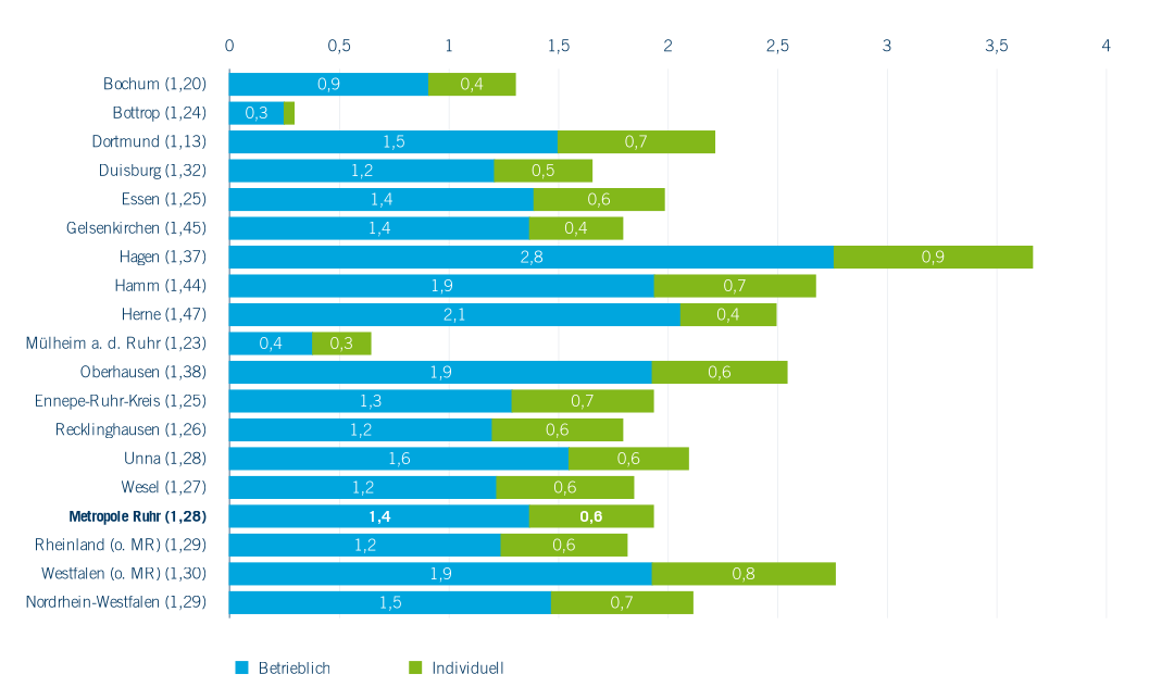 Innerhalb der Metropole Ruhr gibt es zwischen den Städten und Kreisen große Unterschiede bei der Anzahl der ausgegebenen Bildungsschecks je 1.000 Einwohner*innen (Abbildung 6.22). Die niedrigste Inanspruchnahme hat Bottrop mit 0,3 Bildungsschecks, die höchste Hagen mit 3,67. Diese erheblichen Unterschiede sind vor allem auf Unterschiede in den betrieblichen Bemühungen um Bildungsschecks zurückzuführen. Nur in Mülheim a. d. Ruhr und Bottrop liegt auch die individuelle Nachfrage weit unter dem Durchschnitt der Metropole Ruhr. Bei der Ausgabe an die Betriebe übernehmen auch sie die ergänzende Finanzierung der Kurskosten, während bei der individuellen Antragstellung die nicht erstatteten Kursgebühren von den Teilnehmer*innen selbst getragen werden müssen. Im NRW-Vergleich zeigt sich eine etwas günstigere Situation in der Metropole Ruhr als im Rheinland. Beide Regionen werden aber bei der Inanspruchnahme der Bildungsschecks von Westfalen deutlich übertroffen.