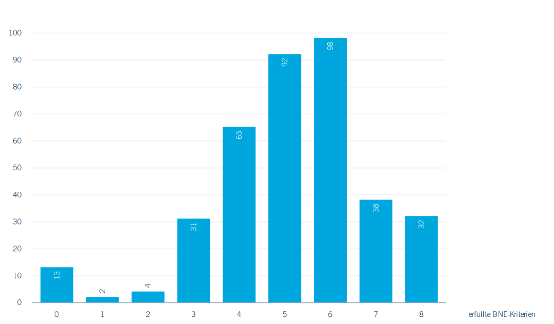 Insgesamt wurden neun BNE-Merkmale identifiziert und das Befragungsinstrument so gestaltet, dass aus den Antworten ersichtlich wird, wie stark die jeweilige Organisation auf die BNE-Aspekte einzahlt: