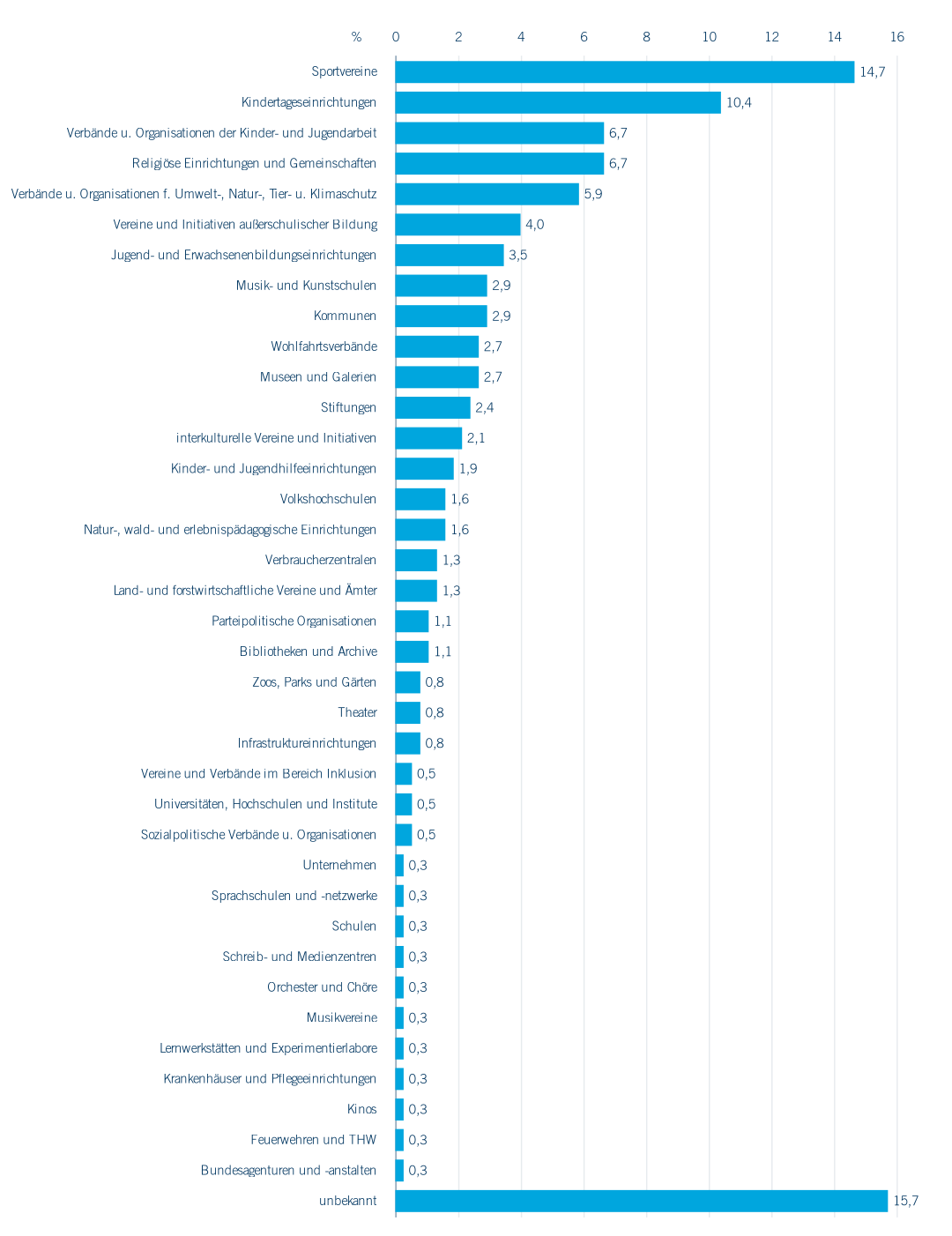 Die Feldphase lief vom 26.10. bis 16.11.2022 und wurde über ein RVR-eigenes Befragungstool in zwei Einladungswellen umgesetzt. Da viele – vor allem kleinere Organisationen – personenbezogene Daten in ihrer Internetpräsenz anführten, wurden solche Organisationen aus Datenschutzgründen nicht befragt. So wurden schließlich etwa 8.000 recherchierte Akteure eingeladen. 375 Organisationen haben auf die Befragung geantwortet (Rücklaufquote ca. 4,7 %), was angesichts der heterogenen Zielgruppe und der abstrakten Thematik für eine Onlinebefragung ein respektables Ergebnis ist (vgl. Freiburg im Breisgau, 2022). Ein großer Teil der Befragten gab in Frage 14 den Namen und Ort der Organisation an, sodass zu 316 Antworten der Akteurstyp bekannt ist (Abbildung 7.7).
