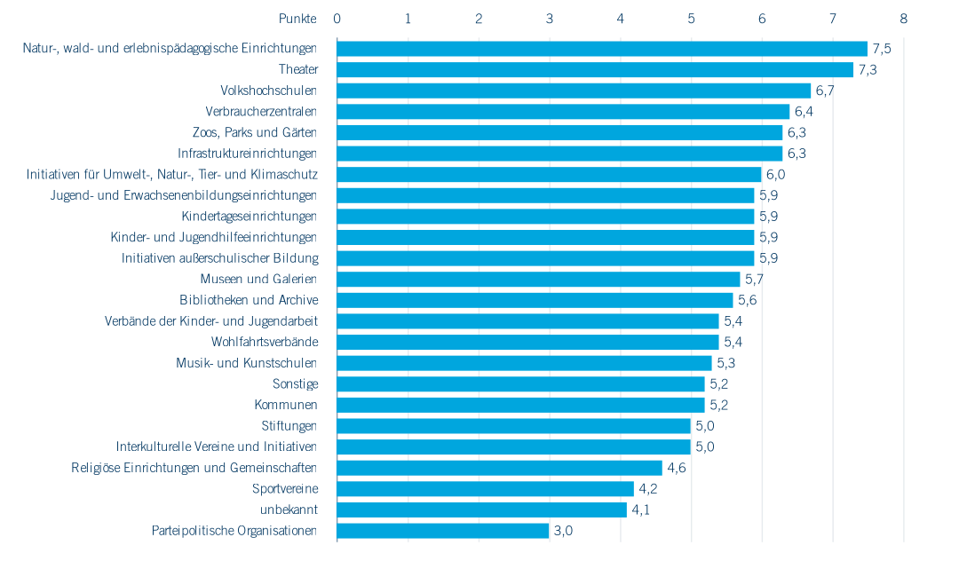 Das durchschnittliche Ergebnis über alle Antworten hinweg liegt bei 5,75 Punkten (von 8). Abbildung 7.9 zeigt die durchschnittlich erreichten Punkte nach Akteurstypen. In der Abbildung sind nur Akteurstypen aus Abbildung 7.7 enthalten, deren Anzahl mindestens drei ist. Als potenzielle BNE-Akteure können die ersten sechs Gruppen bezeichnet werden, allen voran – und durchaus plausibel – natur-, wald- und erlebnispädagogische Einrichtungen. Interessant ist auch, dass mit den Volkshochschulen, Verbraucherzentren und Zoos, Parks und Gärten überwiegen kommunale Betriebe unter den BNE-Akteuren sind. Dass Theater in dieser Gruppe sind, zeigt den hohen Stellenwert kultureller Bildung bei der Umsetzung der im BNE-Konzept angelegten Transformation der Bildung. Größere Bedeutung für das BNE-Thema haben offenbar auch Infrastruktureinrichtungen: Tatsächlich gibt es im Ruhrgebiet große Infrastruktureinrichtungen wie z. B. die Emschergenossenschaft, die im BNE-Bereich sehr aktiv sind.