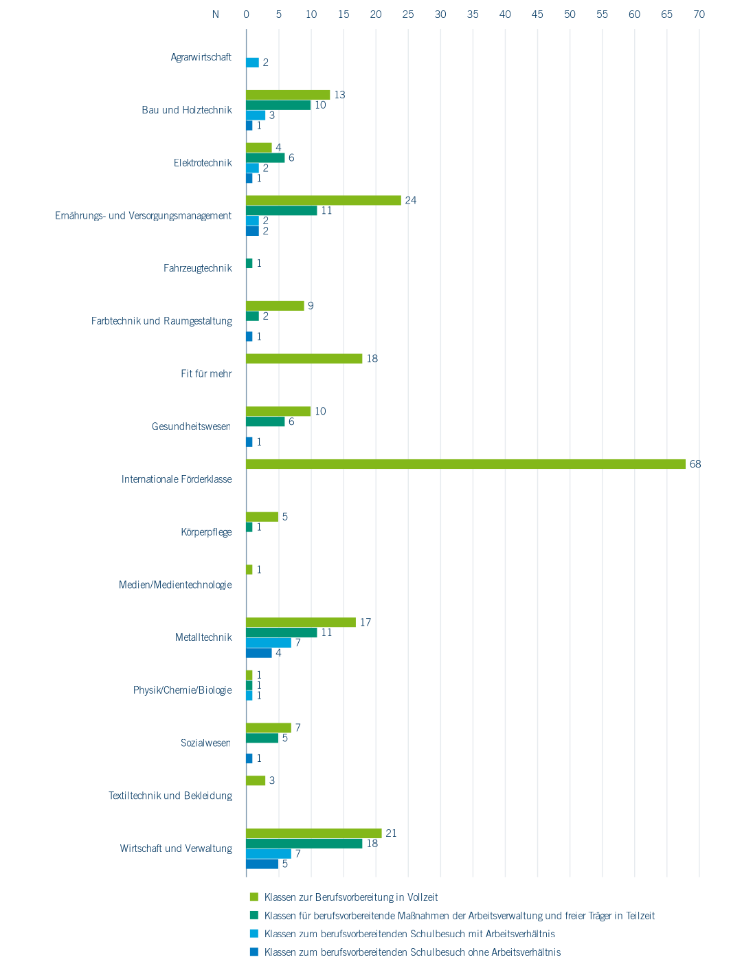 In Berufskollegs sind die Klassen zur Berufsvorbereitung in Vollzeit am stärksten vertreten. Es gibt sie in vielen verschiedenen beruflichen Fachbereichen (Abbildung 4.21), vor allem aber in Metalltechnik, Ernährungs- und Versorgungsmanagement sowie Wirtschaft und Verwaltung. In den Bereichen Gesundheits- und Sozialwesen sowie der Informatik, wo ein deutlicher Fachkräftemangel zu spüren ist und ein hoher Bedarf an Qualifizierung besteht, werden sie eher weniger angeboten. Zudem gibt es an zwei Drittel der Berufskollegs in der Metropole Ruhr internationale Förderklassen, die für die Integration Geflüchteter von hoher Bedeutung sind.