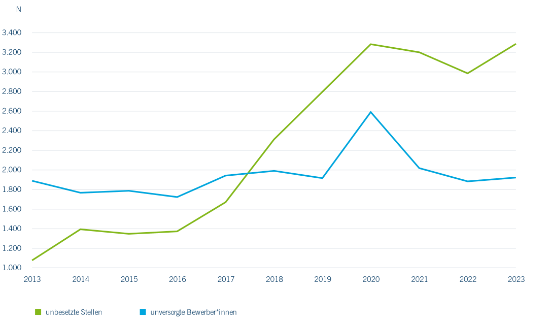 Die Anzahl der unbesetzten Ausbildungsstellen ist vermutlich noch höher als in Abbildung 4.3 ausgewiesen, da sie auf Daten der Bundesagentur für Arbeit basieren, in denen nur die gemeldeten Ausbildungsstellen nach dem Berufsbildungsgesetz (BBiG) und der Handwerksordnung (HwO) aufgenommen werden. Hinzu kommen die offenen Stellen, die von den Ausbildungsbetrieben nicht gemeldet wurden, und insbesondere werden die schulischen Ausbildungsgänge nicht berücksichtigt (Fitzenberger et al., 2024).