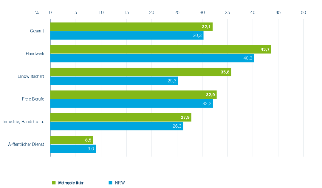 Differenziert nach Berufsbereichen (Abbildung 4.15) werden große branchenspezifische Unterschiede sichtbar. In einem Sektor wie dem öffentlichen Dienst mit klaren Strukturen auch in der Ausbildung wird nicht mal jedes zehnte Ausbildungsverhältnis vorzeitig gelöst. Demgegenüber sind es im Handwerk bereits über 40 %, was in einer besonders vom Fachkräftemangel betroffenen Branche erhöhter Beachtung bedarf.