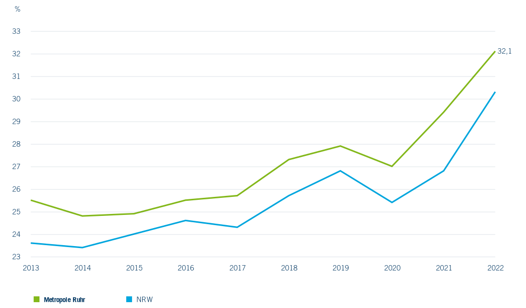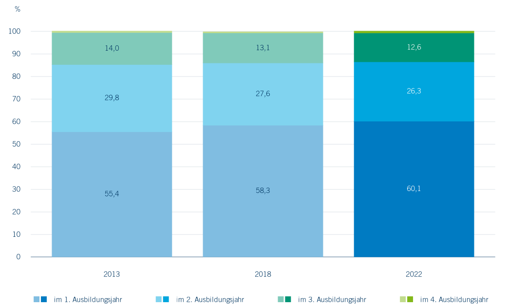 Im Gegensatz zu den Bestehensquoten deuten die vorzeitigen Auflösungsquoten der Ausbildungsverträge auf mögliche Problemlagen und daraus resultierende Handlungsbedarfe für Unternehmen und Bildungspolitik hin. Wie der Abbildung 4.13 zu entnehmen ist, steigt die Vertragslösungsquote sowohl in NRW als auch im Ruhrgebiet im letzten Jahrzehnt deutlich an. In der Metropole Ruhr wird mittlerweile fast jedes dritte Ausbildungsverhältnis vorzeitig beendet, wozu viele Bedingungen beitragen können. Betrachten wir zusätzlich die Daten aus der Abbildung 4.14, so sehen wir, dass insbesondere Abbrüche im ersten Ausbildungsjahr zugenommen haben. Das deutet darauf hin, dass hier Matchingprobleme zwischen Auszubildenden und Betrieb und/oder falsche oder mangelnde Vorstellungen über den zu erlernenden Beruf zur frühzeitigen Auflösung des Ausbildungsverhältnisses führen. Hier offenbart sich ein Orientierungsproblem, dem mit einer adäquaten Beratung zu Berufen und Ausbildungswegen bereits in den Schulen begegnet werden könnte (vgl. Siembab et al., 2023).