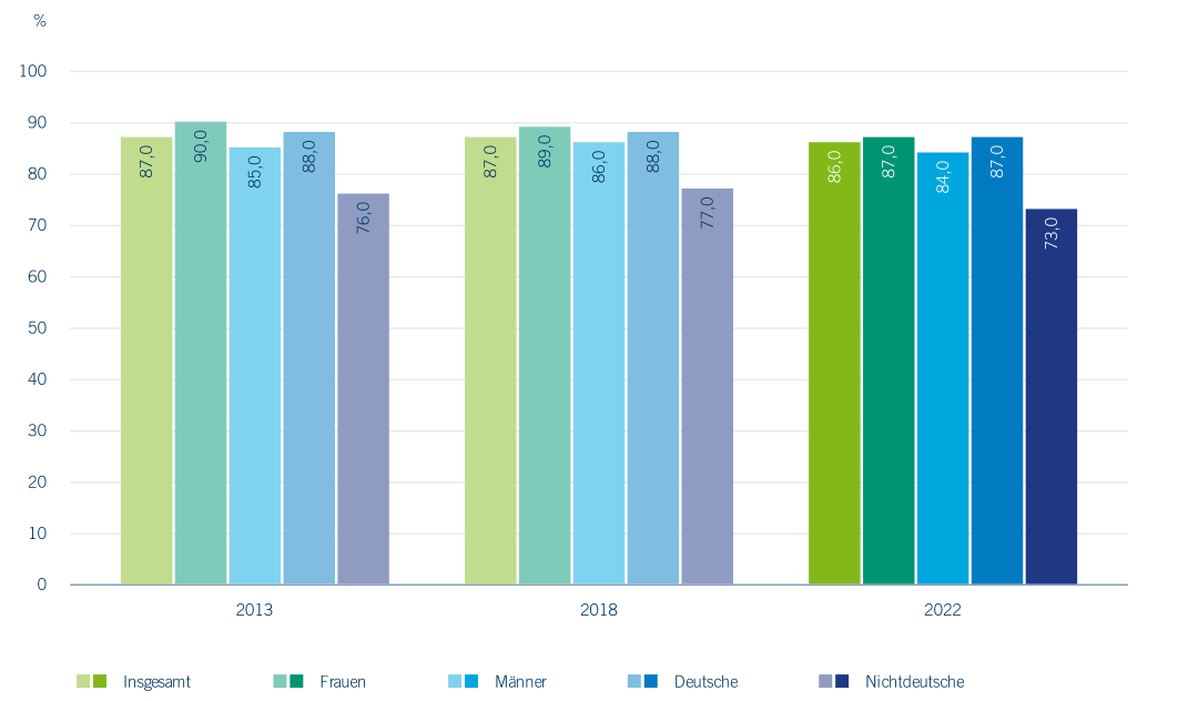 Ein wichtiges Indiz für den Erfolg einer beruflichen Ausbildung ist die Entwicklung der erfolgreich abgelegten Abschlussprüfungen. Die Bestehensquoten bewegen sich von 2013 bis 2022 auf einem konstant hohen Niveau (Abbildung 4.12). Die Differenzierungen zeigen, dass Frauen erfolgreicher ihre Prüfungen ablegen als Männer und deutsche Prüflinge häufiger bestehen als nicht deutsche. Gerade für die letztgenannte Gruppe offenbart sich Handlungsbedarf hinsichtlich der Unterstützungsmaßnahmen zur Vorbereitung auf die Abschlussprüfungen und ggf. bereits während der Ausbildung, um ihre weitere berufliche Laufbahn nicht zu gefährden.