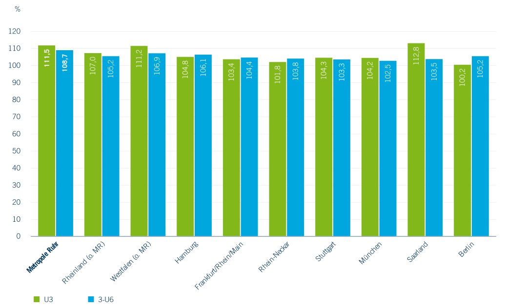 Insgesamt hat sich der Ausbau der frühkindlichen Bildung seit 2019 bundesweit fortgesetzt (Abbildung 2.1), allerdings ist die Anzahl der betreuten Kinder – in Kindertageseinrichtungen (Kitas) und in der Kindertagespflege – weit weniger deutlich angestiegen als in der Zeit kurz nach Inkrafttreten des Rechtsanspruchs auf Kindertagesförderung für unter Dreijährige im Jahr 2013. Auch die Unterschiede in der Entwicklungsdynamik haben sich reduziert; der Anstieg der Zahlen in der Metropole Ruhr unterscheidet sich kaum noch von der Entwicklung in anderen Metropolregionen, wobei ein Blick auf die Entwicklung in der Metropole Ruhr im Folgenden zeigen wird, dass die einzelnen Kommunen weiterhin unterschiedliche Wege gehen.