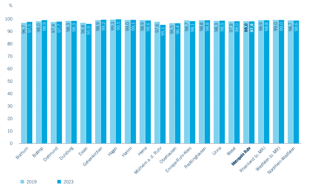 Während bisher nur die Gesamtzahl der betreuten Kinder thematisiert wurde, soll nun zwischen Kitas und Kindertagespflege differenziert werden. Der Rechtsanspruch für unter Dreijährige kann durch beide Betreuungsformen erfüllt werden; ab dem Alter von drei Jahren haben Kinder hingegen bis zum Schuleintritt einen Anspruch auf einen Kitaplatz. Von den betreuten Kindern dieser Altersgruppe besuchen demzufolge im Jahr 2023 in der Metropole Ruhr 97,9 % eine Kita (mit einer Variation zwischen 95,1 % in Mülheim an der Ruhr und 99,5 % in Hagen), im Landesdurchschnitt liegt dieser Wert bei 98,6 % (Abbildung 2.14). Gegenüber dem Jahr 2013 waren diese Werte schon bis 2019 leicht gesunken, was mit der angesprochenen Knappheit an Kitaplätzen zusammenhängen dürfte. Dass der Anteil der Kinder ohne Kitaplatz seit 2019 weiter gestiegen ist, der Anteil der Kindertagespflege jedoch nahezu konstant niedrig geblieben ist, deutet darauf hin, dass Kitaplätze in dieser Altersgruppe nicht durch Kindertagespflege substituierbar sind.