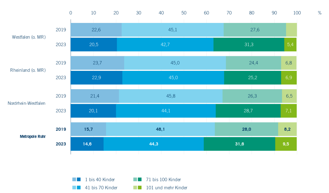 Weiterhin erfolgt der Platzausbau nicht nur durch die Gründung neuer Kitas, sondern nicht zuletzt durch den Trend hin zu größeren Einrichtungen (Abbildung 2.5). Der Anteil von Einrichtungen mit mehr als 70 Kindern ist in der Metropole Ruhr wie auch landesweit seit 2019 weiter gestiegen – von 36,2 % auf 41,1 %.