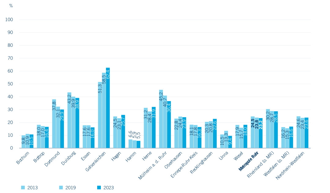 Anteil öffentlicher Träger liegt 2023 zwischen 6,4 % in Hamm und 60,6 % in Gelsenkirchen, wo kontinuierlich sogar ein weiterer Anstieg festzustellen ist. Ein leichter Anstieg des Anteils von Einrichtungen in öffentlicher Trägerschaft findet sich seit 2019 außerdem in Hagen und Herne und in den Kreisen Recklinghausen und Wesel.