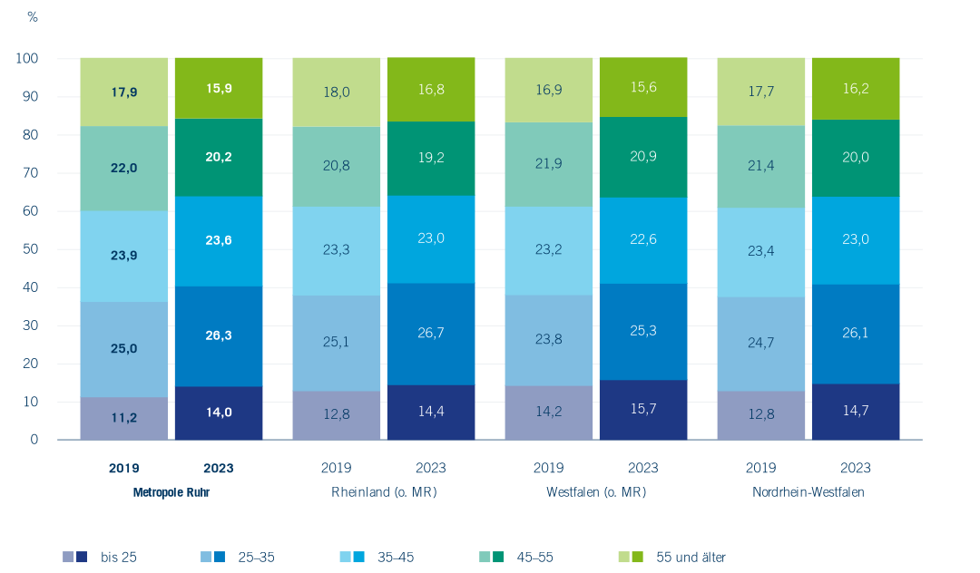 Die Anzahl der Kindertageseinrichtungen in der Region ist seit 2019 weiter gestiegen (Abbildung 2.2). Im Jahr 2013 gab es hier 2.392 Kitas; 2019 waren es 2.541 und 2023 2.698. Als ein zentraler Engpassfaktor für den weiteren Ausbau der frühen Bildung, aber auch für die Aufrechterhaltung der vertraglich zugesicherten Betreuungszeiten wird inzwischen der wachsende Personalmangel diskutiert – obwohl die Entwicklung der Beschäftigtenzahlen weiterhin positiv ist (Abbildung 2.3), wobei der Anstieg in der Metropole Ruhr inzwischen sogar etwas stärker ausfällt als im Landesdurchschnitt. Mit einem Anstieg der Beschäftigtenzahlen um knapp 20 % (in Vollzeitäquivalenten) kann die frühe Bildung weiterhin als ein dynamisches Element auf dem Arbeitsmarkt bezeichnet werden. Bei der Entwicklung der Altersstruktur zeigen sich inzwischen erste Erfolge der Anstrengungen im Feld der Ausbildung