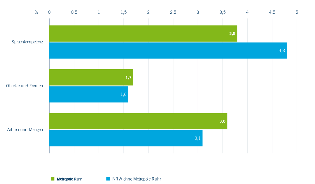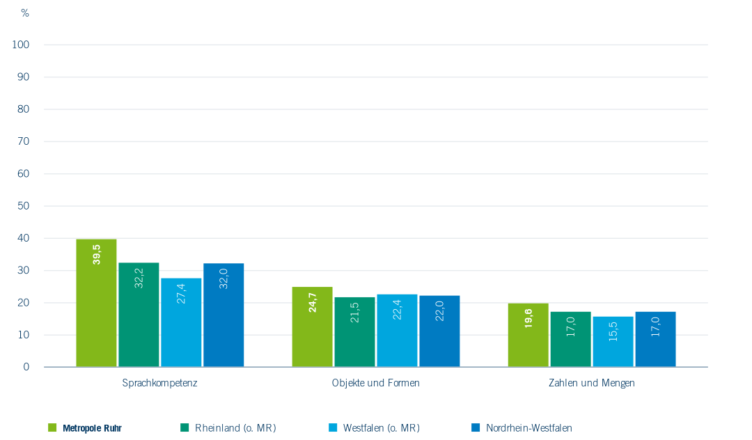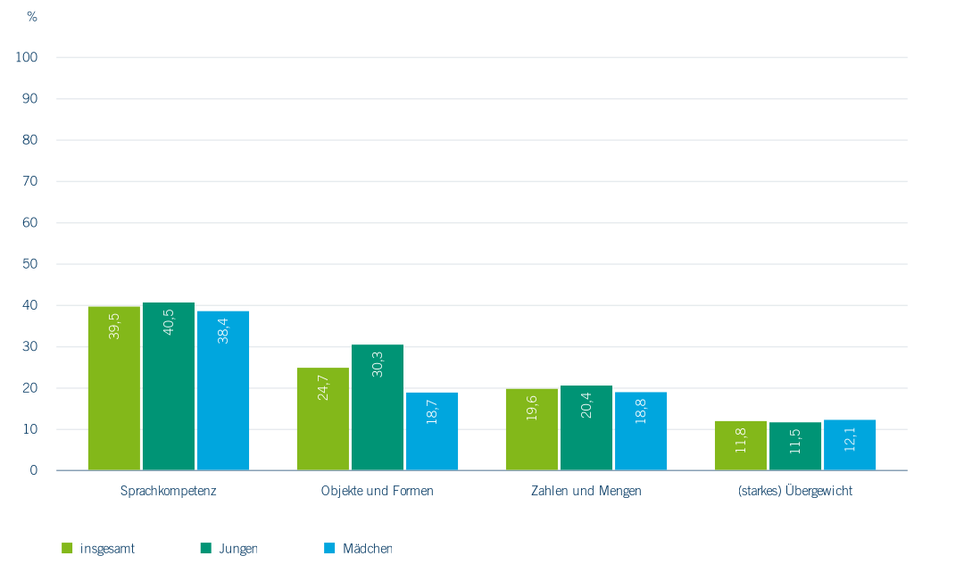 In der Metropole Ruhr (Abbildung 2.28) weisen 40 % der Einschulungskinder deutliche Einschränkungen bei der Sprachkompetenz auf. Ein Viertel der Kinder zeigt Auffälligkeiten im Bereich des Erkennens und Zeichnens von Objekten und Formen, und jedes fünfte Kind kann Zahlen oder Mengen nicht altersgemäß erfassen und vergleichen. Fast jedes achte Kind (11,8 %) ist bereits bei der Einschulung übergewichtig oder adipös. Bewegungsmangel, oft verbunden mit hohem Medienkonsum, und unausgewogene Ernährung sind die vorrangigen Ursachen für Übergewicht bei Kindern. Jungen zeigen häufiger Auffälligkeiten als Mädchen, wobei der Unterschied im Bereich des Erkennens und Zeichnens von Objekten und Formen besonders ausgeprägt ist.