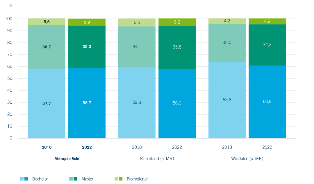 Wird die Art der Hochschulabschlüsse betrachtet, zeigt sich ein sehr homogenes Bild über ganz NRW. Wie in Abbildung 5.8 dargestellt, werden rund sechs von zehn Hochschulstudien mit einem Bachelor abgeschlossen, gut ein Drittel mit einem Masterabschluss, und ca. 5 % der Studien werden mit einer Promotion abgeschlossen. Allerdings lassen sich aus diesen Daten keine Informationen zu Studienabbrüchen oder Studiengangwechseln ziehen (Schneider et al., 2019). Somit spiegeln die gezeigten Indikatoren den Studienerfolg nur unzureichend wider. Zu einer umfassenden Betrachtung und Einschätzung des Studienerfolgs an den Hochschulen der Metropole Ruhr wären Daten zum Studienabbruch erforderlich; diese liegen aber nicht vor und sind methodisch komplex zu erheben (Heublein 2017). Informationen zur Dauer bis zum Abschluss, zu den erworbenen Kompetenzen oder zu Abschlussnoten wurden bislang auf dieser Ebene nicht zusammengeführt oder liegen im Fall der Kompetenzen nur als Selbsteinschätzungen von Studierenden zu einzelnen Bereichen, wie Digitalkompetenzen vor. Hier liegen noch Potenziale der Datennutzung, will man die Qualität des Hochschulsektors besser einordnen. Unterkapitel 5.4 versucht sich deshalb der Passung zwischen Hochschulbildung und Arbeitsmarkt zu nähern.