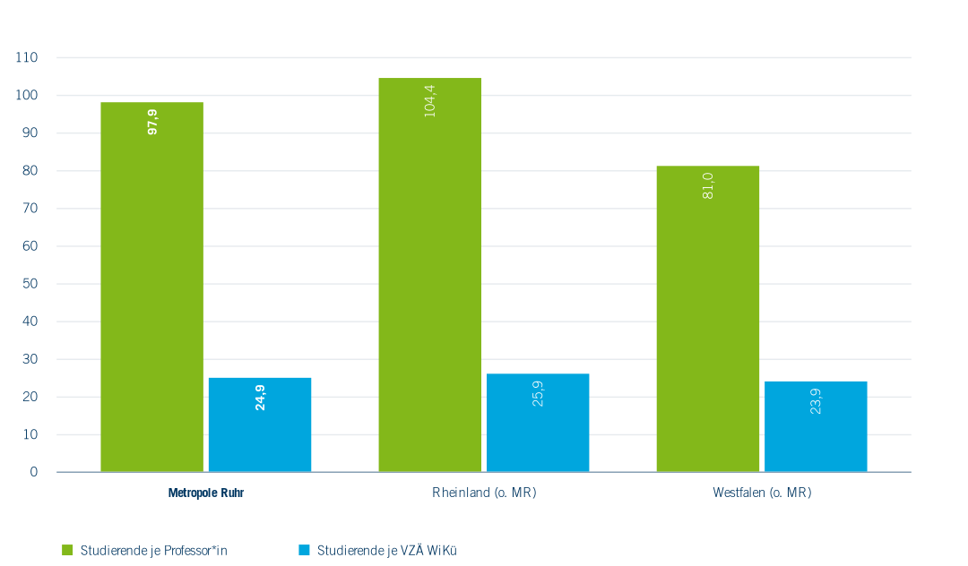 Natürlich ist die Zahl der Studierenden oder das Erreichen der Hochschulzugangsberechtigung allein kein Indikator einer qualitativ hochwertigen und an die Bedarfe des Arbeitsmarktes angepassten Hochschulbildung. Daten aus den gemeinsamen Studierendenbefragungen der RuhrFutur-Hochschulen liefern Indikatoren, werden aber auf der Maßnahmenebene vor allen Dingen hochschulintern genutzt. Als ein übergreifender Qualitätsindikator der Hochschulbildung kann die Betreuungsrelation von Studierenden pro Professor*in an den Universitäten des Ruhrgebietes herangezogen werden (Abbildung 5.6). Sie liegt im Mittel bei 97,9 Studierenden pro Professor*in. Damit schneiden die Universitäten der Metropole Ruhr zwar besser ab als die des Rheinlandes, wo im Mittel 104,4 Studierende durch eine*n Professor*in betreut werden, aber schlechter als in Westfalen (81 Studierende pro Professor*in). Nimmt man das Verhältnis von Studierenden zu wissenschaftlichen Mitarbeitenden hinzu, sind die Unterschiede zwischen den drei Regionen nur minimal: das Verhältnis bewegt sich zwischen 23,9 und 25,9.