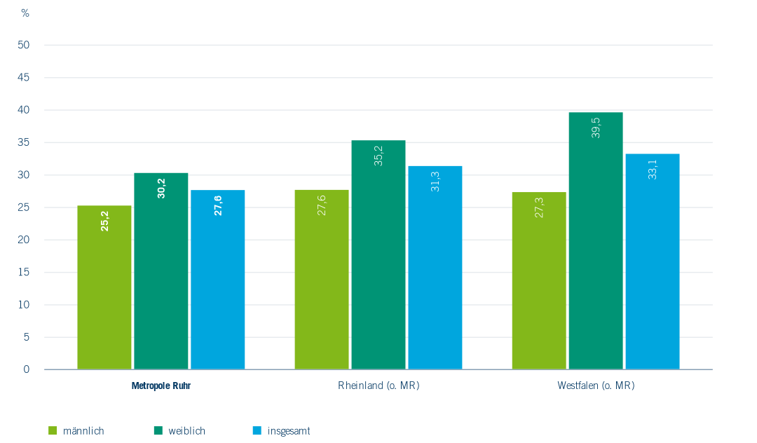 In der Metropolregion Ruhr liegt diese Quote im Jahr 2022 mit 27,6 % deutlich unter den Quoten des Rheinlands (31,3 %) und Westfalens (33,1 %). Allerdings fallen die Unterschiede zwischen den Geschlechtern in der Metropolregion Ruhr deutlich geringer als in den übrigen Regionen aus. Wie in Abbildung 5.7 dargestellt, ist die geringe Erstabsolvent*innenquote in der Metropolregion Ruhr auf die im Vergleich unterdurchschnittliche Quote der Absolventinnen zurückzuführen. Diese wiederum ist durch die niedrige Zahl an Studienanfängerinnen bedingt, da weiterhin unterdurchschnittlich wenige Frauen mit Hochschulzugangsberechtigung im Ruhrgebiet auch tatsächlich ein Studium aufnehmen.