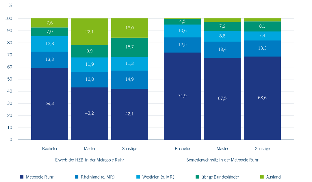 Die Mehrheit der Studierenden (85,4 %) eines Bachelorstudiengangs in der Metropole Ruhr hat ihre Hochschulzugangsberechtigung (HZB) in NRW erworben, sechs von zehn Studierenden sogar im Ruhrgebiet. In Master- und weiteren Studiengängen ist der Anteil derjenigen Studierenden, die aus der Region kommen, etwas geringer. Im Vergleich zum Bildungsbericht 2020 zeigt sich, dass sich der Anteil der Studierenden aus NRW über alle Studienformen verringert hat (RuhrFutur & Regionalverband Ruhr, 2020), was sowohl mit der geringeren Studienanfänger*innenquote als auch mit dem Zuzug von Studierenden aus dem übrigen Bundesgebiet und dem Ausland erklärt werden kann. Während des Studiums wohnen die Studierenden des Ruhrgebiets auch überwiegend in der Metropole Ruhr (67,5 % bis 71,9 % je nach Studienabschluss) bzw. im übrigen NRW (20,7 % bis 23,1 %). Nur ein geringer Teil von 5,0 % der Bachelorstudierenden, 10,3 % der Masterstudierenden und 10,7 % der Studierenden in Fächern mit sonstigen Studienabschlüssen hat den Semesterwohnsitz außerhalb von NRW (Abbildung 5.5).