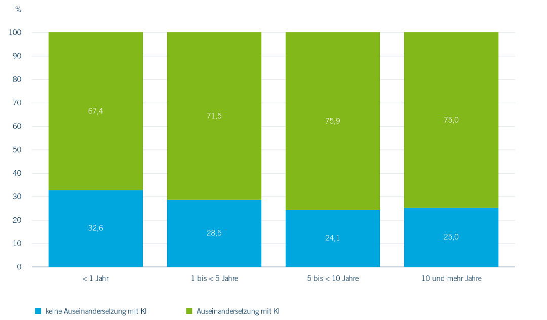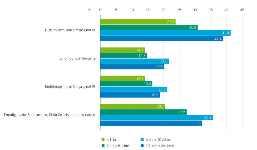 Obwohl rund drei Viertel der befragten Lehrenden KI als Chance für die Lehre sehen, binden aktuell nur rund 20 % dieser Befragten KI aktiv in die Lehre ein. Wie in Abbildung 5.20 dargestellt, gibt es hier aber Unterschiede zwischen den Lehrenden. So geben diejenigen mit mehr Lehrerfahrung an, verstärkt KI in der Lehre einzusetzen als auch Studierende zu ermutigen, KI im Rahmen ihres Selbststudiums zu nutzen. Auch geben erfahrene Lehrende eher eine Einführung zum Umgang mit KI im Rahmen ihrer Lehre an und initiieren entsprechende Diskussionen zum ethischen Umgang mit KI. Die Vergleiche nach der bisherigen Erfahrung der Lehrenden lassen sich jedoch nicht verallgemeinern, da die Befragungsdaten nicht repräsentativ für alle Lehrenden an den Hochschulen in der Metropole Ruhr sind. Tendenziell weisen die Ergebnisse aber darauf hin, dass KI bislang nur wenig im Rahmen der Hochschullehre eingesetzt wird.