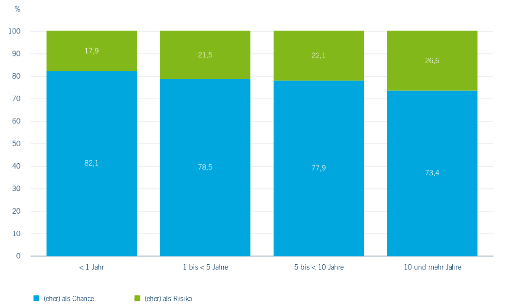 Eng verbunden mit dem Einsatz digitaler Werkzeuge ist auch der Einsatz künstlicher Intelligenz (KI) zur Unterstützung in der Lehre. Die Mehrheit der Befragten (75,9 %) sieht den Einsatz von KI als Chance, während nur rund ein Viertel (24,1 %) KI als Risiko einschätzt. Weniger erfahrene und damit vermutlich jüngere Lehrende haben weniger Vorbehalte gegenüber KI zur Unterstützung in der Lehre (Abbildung 5.18). Unterschiede zwischen männlichen und weiblichen Lehrenden finden sich nicht; allerdings gibt es Unterschiede nach Fächern (Abbildung 5.19): Insbesondere in den Geisteswissenschaften wird der Einsatz von KI deutlich stärker als Risiko empfunden als zum Beispiel in den Rechts-, Wirtschafts- und Sozialwissenschaften oder in den Ingenieurwissenschaften.