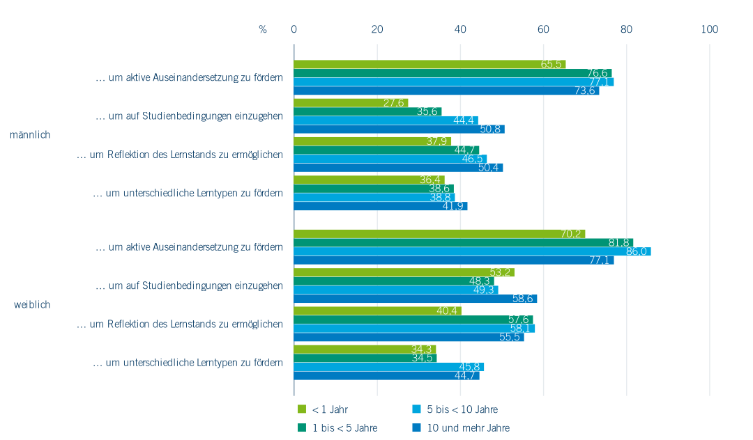 Die Lehrenden geben an, dass digitale Tools überwiegend eingesetzt werden, um Studierende „zur aktiven Auseinandersetzung mit den Lehrinhalten zu motivieren“ (76,7 %), aber auch um die Reflektion des individuellen Lernstands zu ermöglichen (50,5 %) und auf die heterogenen Studienbedingungen der Lernenden eingehen zu können (50,9 %). Hier zeigen sich jedoch deutliche Unterschiede zwischen den Befragten: So geben erfahrene Lehrende deutlich häufiger als ihre Kolleginnen und Kollegen mit weniger Erfahrung in der Hochschullehre an, digitale Tools zu nutzen, um auf die heterogenen Studienbedingungen der Studierenden eingehen und somit die Studierenden individuell unterstützen zu können. Auch weibliche Lehrende geben häufiger als ihre männlichen Kollegen an, digitale Tools zu nutzen, um Studierenden die Reflektion ihres individuellen Lernstands zu ermöglichen (Abbildung 5.17).