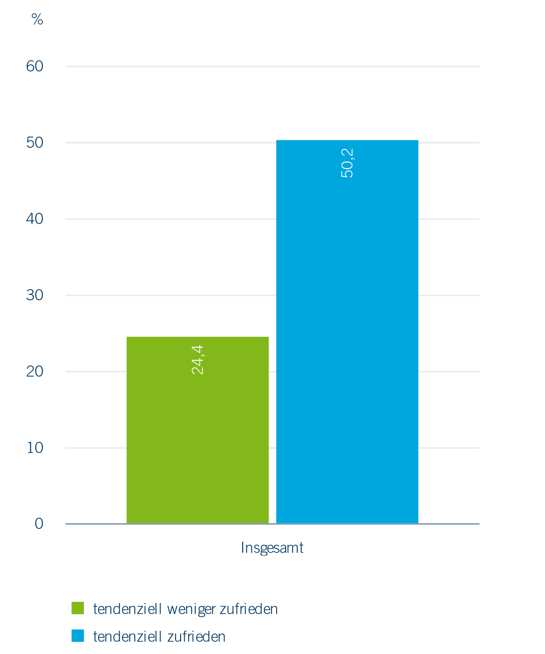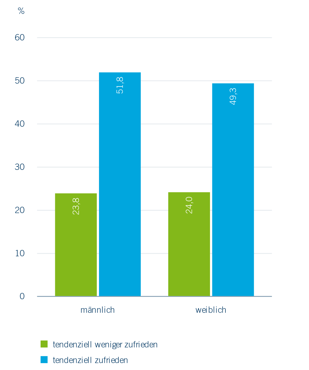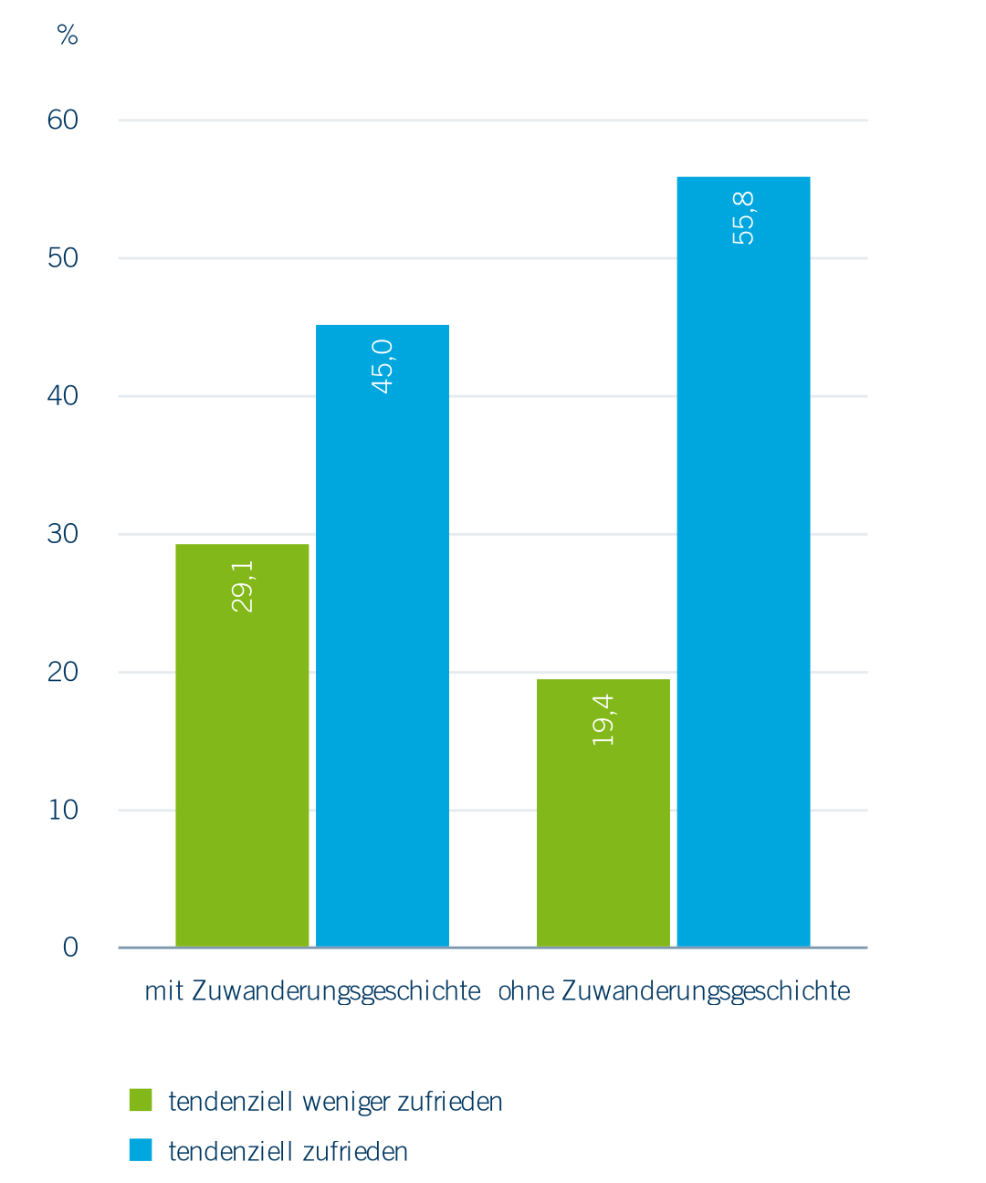 Mit der eigenen Studienleistung war im WS 2023/24 gut ein Viertel der befragten Studierenden (24,4 %) eher unzufrieden (Abbildung 5.27), wohingegen etwas mehr als die Hälfte der Befragten (50,2 %) den eigenen Studienleistungen eher positiv gegenüberstand. Studierende mit Zuwanderungsgeschichte und Frauen standen den eigenen Leistungen etwas kritischer gegenüber und gaben an, tendenziell etwas weniger zufrieden mit ihren Leistungen zu sein.