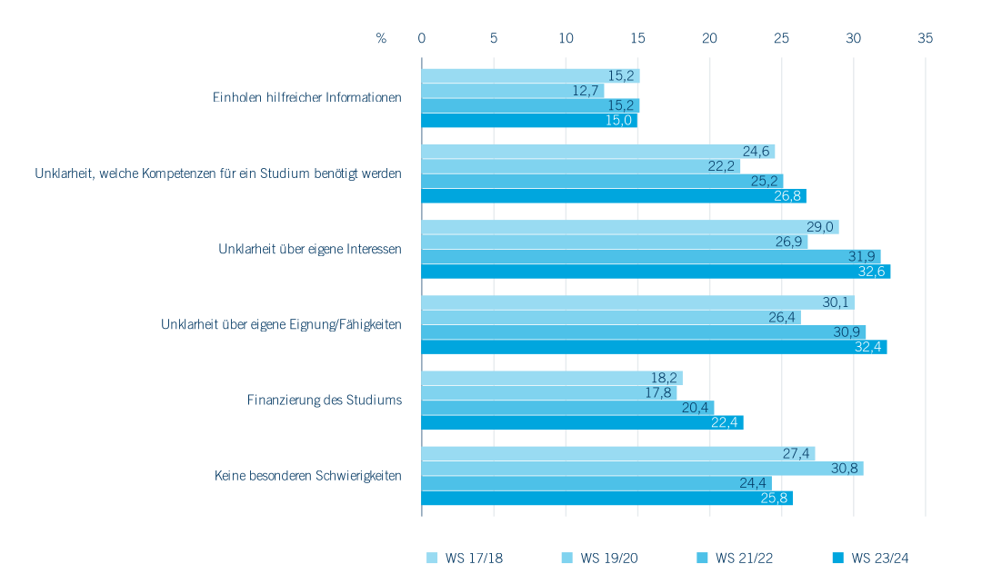 Über die verschiedenen Wellen der Studierendenbefragung wurden Studierende des ersten Semesters auch hinsichtlich ihrer Schwierigkeiten bei der Studienwahl befragt. Die Ergebnisse dieser Befragungen sind sehr konstant über die Zeit. Gut ein Viertel der Studierenden gibt an, keine besonderen Schwierigkeiten zu haben. Allerdings waren sich rund ein Viertel bis ein Drittel der Studierenden nicht über ihre eigenen Interessen und Fähigkeiten im Klaren, und sie waren sich auch unsicher, welche Kompetenzen für ein Studium benötigt werden (Abbildung 5.25). Deshalb müssten Schulen und Hochschulen stärker die Studierfähigkeit der Jugendlichen bzw. Studierenden sicherstellen. Zahlreiche Maßnahmen und Projekte unterstützen bereits die Studienorientierung; zudem sollten Hochschulen ergänzend zu ihrem bisherigen Engagement die Studierenden noch stärker während der Studieneingangsphase unterstützen, da in den ersten Semestern die Grundlagen für ein erfolgreiches Studium gelegt werden.