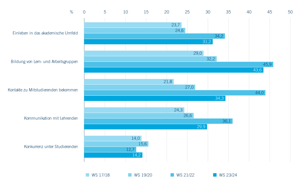Für rund drei von zehn Studierenden (29,9 %) stellt auch die Kommunikation mit Lehrenden eine Herausforderung im Hochschulalltag dar. Während der Pandemie war dieser Wert zwar höher (36,1 %), was vermutlich auf die veränderten Lehr- und Lernbedingungen sowie die verstärkte Nutzung digitaler Kommunikationsmittel zurückzuführen war, doch bleibt diese Herausforderung weiter bestehen. Das weist darauf hin, dass trotz der Rückkehr zu Präsenzveranstaltungen und der Normalisierung des Studienbetriebs die Unsicherheiten und Barrieren im Umgang mit Lehrenden nicht vollständig überwunden sind.