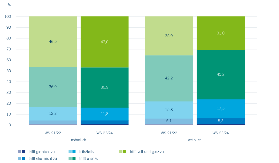 Im Rahmen der Befragung im WS 2023/24 gaben insgesamt 84,7 % der männlichen und 70,0 % der weiblichen Studierenden an, dass ihnen der Umgang mit digitalen Technologien leichtfällt (Abbildung 5.22). Dabei gibt es bei den Frauen keine Veränderung zur befragten Kohorte des WS 2021/22; bei den Männern geben nun etwas mehr Studierende an, dass ihnen der Umgang leichtfällt. Da die Studierenden ihre Kompetenzen im Rahmen der Befragung selbst einschätzen sollten, lässt sich nicht schlussfolgern, ob männliche Studierende tatsächlich höhere digitale Kompetenzen haben als Frauen. Auch traut sich die große Mehrheit der befragten Studierenden zu, digitale Anforderungen zu bewältigen (Abbildung 5.23), was aber ebenfalls eine subjektive Einschätzung ist.