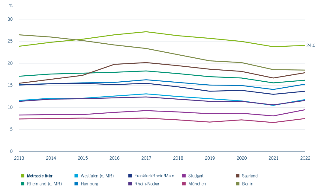 Der Vergleich der NEF-Quoten der Metropolregionen in Abbildung 1.14 (Seite 32) zeigt, dass die Quoten in vielen Regionen im Gegensatz zum Ruhrgebiet (–2,2 Prozentpunkte) und Berlin (–3,5 Prozentpunkte) weniger stark gesunken sind. In München (+0,3 Prozentpunkte) und Stuttgart (+0,5 Prozentpunkte) stieg die Quote sogar leicht an. Hinsichtlich des Niveaus der Kinderund Jugendarmut zeigen sich jedoch im Vergleich zum Jahr 2018 keine Veränderungen. In den süddeutschen Vergleichsregionen ist die SGB-II-Quote der Minderjährigen weiterhin sehr gering. Auffällig ist, dass der Trend sinkender Quoten, der im letzten Bildungsbericht für Berlin festgestellt wurde, nun – wenn auch weniger stark ausgeprägt – in der Metropole Ruhr zu beobachten ist. Wie bereits im vergangenen Bildungsbericht für Berlin festgestellt wurde, steigt parallel auch im Ruhrgebiet die Anzahl unter 15-jähriger Personen in diesem Zeitraum an (+7 % Prozentpunkte). Ob die Verbesserung der sozialen Lage der Minderjährigen – wie damals für Berlin vermutet – durch den Zuzug ökonomisch stärkerer Bevölkerungsgruppen zustande gekommen sein könnte oder durch den Zuzug von Kindern und Jugendlichen, die andere Transferleistungen erhalten (bspw. Regelleistungen nach dem AsylbLG), kann an dieser Stelle nicht geklärt werden.