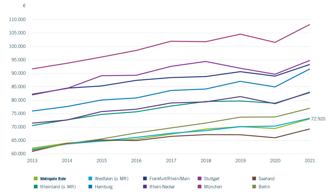 Abbildung 1.19 zeigt für die Metropolregionen die Entwicklung der Arbeitsproduktivität in den Jahren 2013 bis 2022. In allen Regionen kann – wenn auch unterschiedlich stark ausgeprägt – eine positive Entwicklung nach dem Einbruch im ersten Corona-Jahr festgestellt werden. Wie bereits in der Vergangenheit ist die Dynamik im Vergleich der Regionen deutlich unterschiedlich. Die Region München weist, ausgehend von einem bereits hohen Niveau, das stärkste Wachstum auf und liegt im Hinblick auf die Zuwächse mit Ausnahme von Hamburg weit vor den anderen Regionen. Dabei überholt sie auch andere wirtschaftlich starke Regionen wie Stuttgart oder Frankfurt/Rhein/Main. Das Ruhrgebiet belegt mit 72.920 € je Erwerbstätigem im Jahresdurchschnitt weiterhin den vorletzten Platz der Vergleichsregionen.